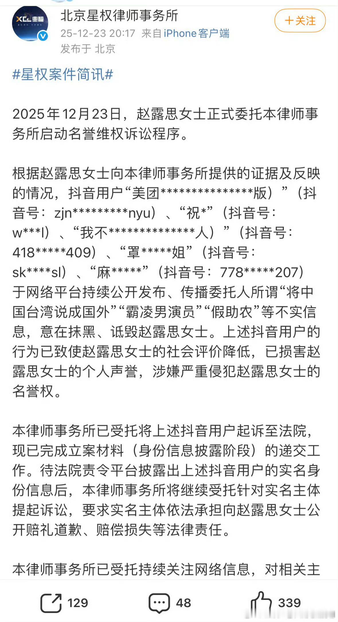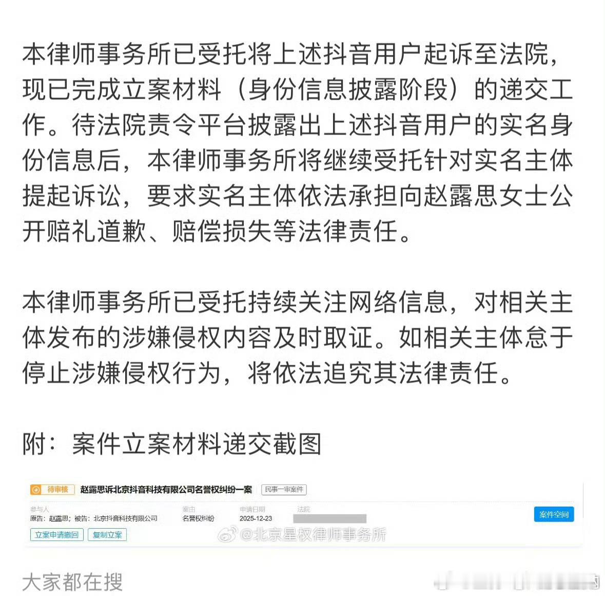 赵露思告黑了,钟对“霸凌男演员”、“假助农”等不实信息维权
