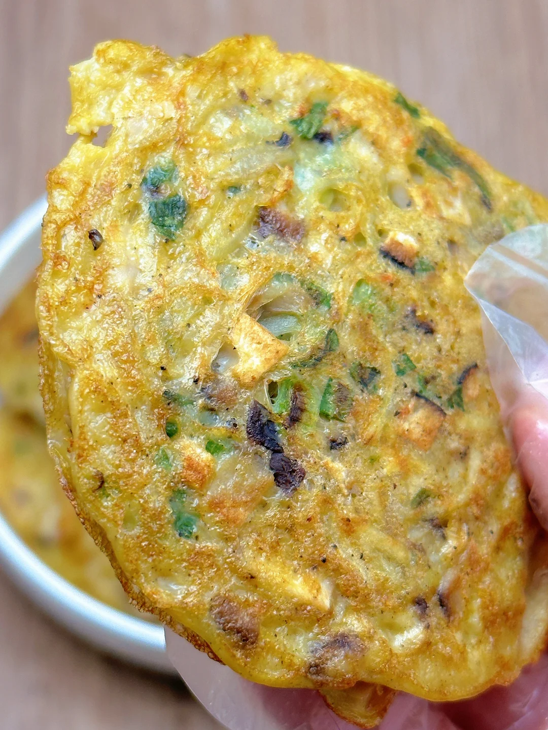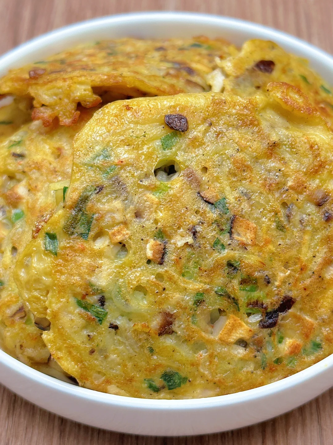 4⃣️锅里少油最小火放入饼,煎制两面金黄即可开吃(第一面煎2~3分钟再翻面哟,不然容易不成型哟)