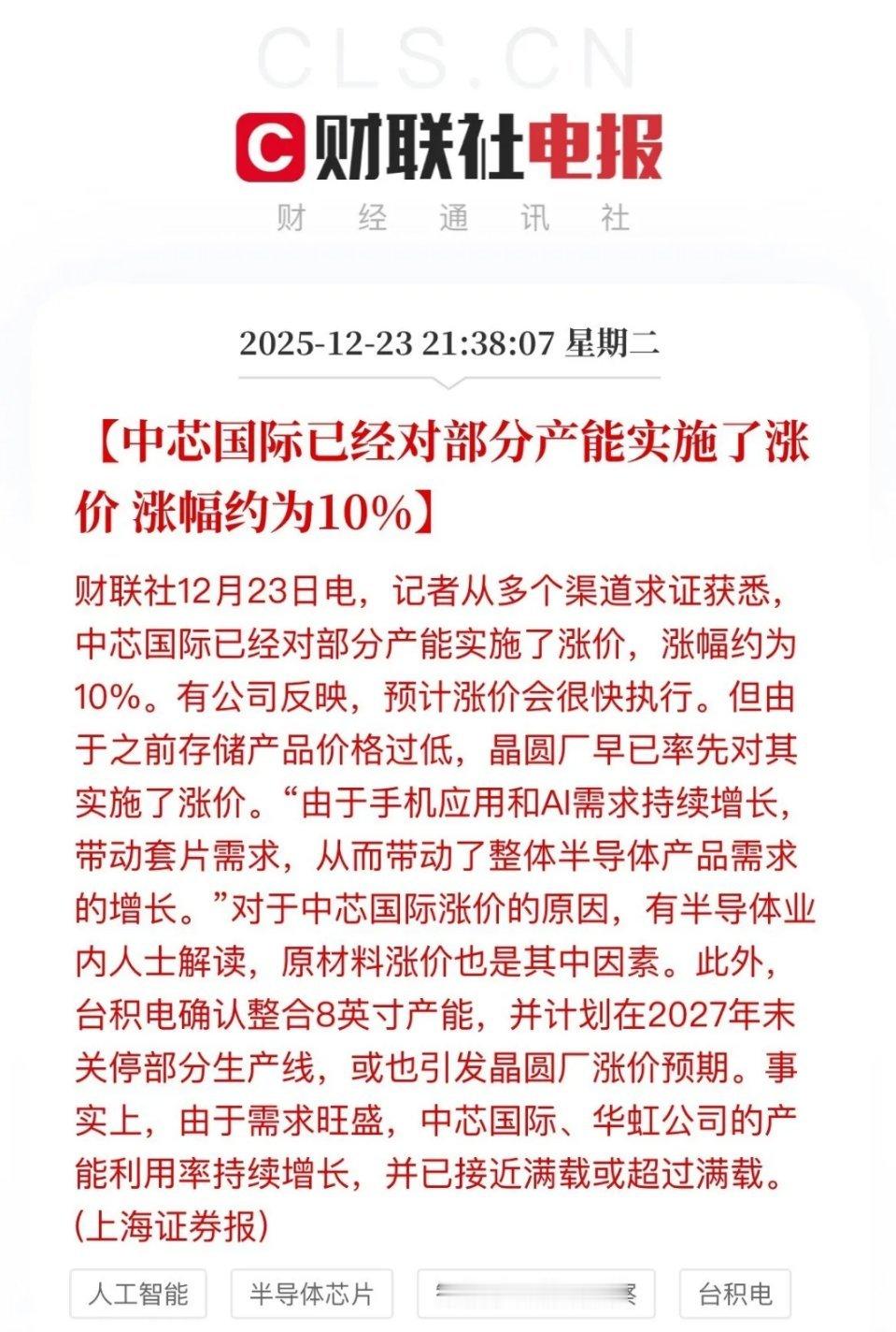 半导体再迎利好,中芯国际宣布对部分产品实施涨价,涨幅约10%,明天半导体继续嗨了由于需求旺盛,中芯、华虹产能已经饱和,或者超载了,然后台积电说要整合8英寸产能,要关停部分生产线,引发了市场涨价预期,来吧,来的更猛烈一些吧。