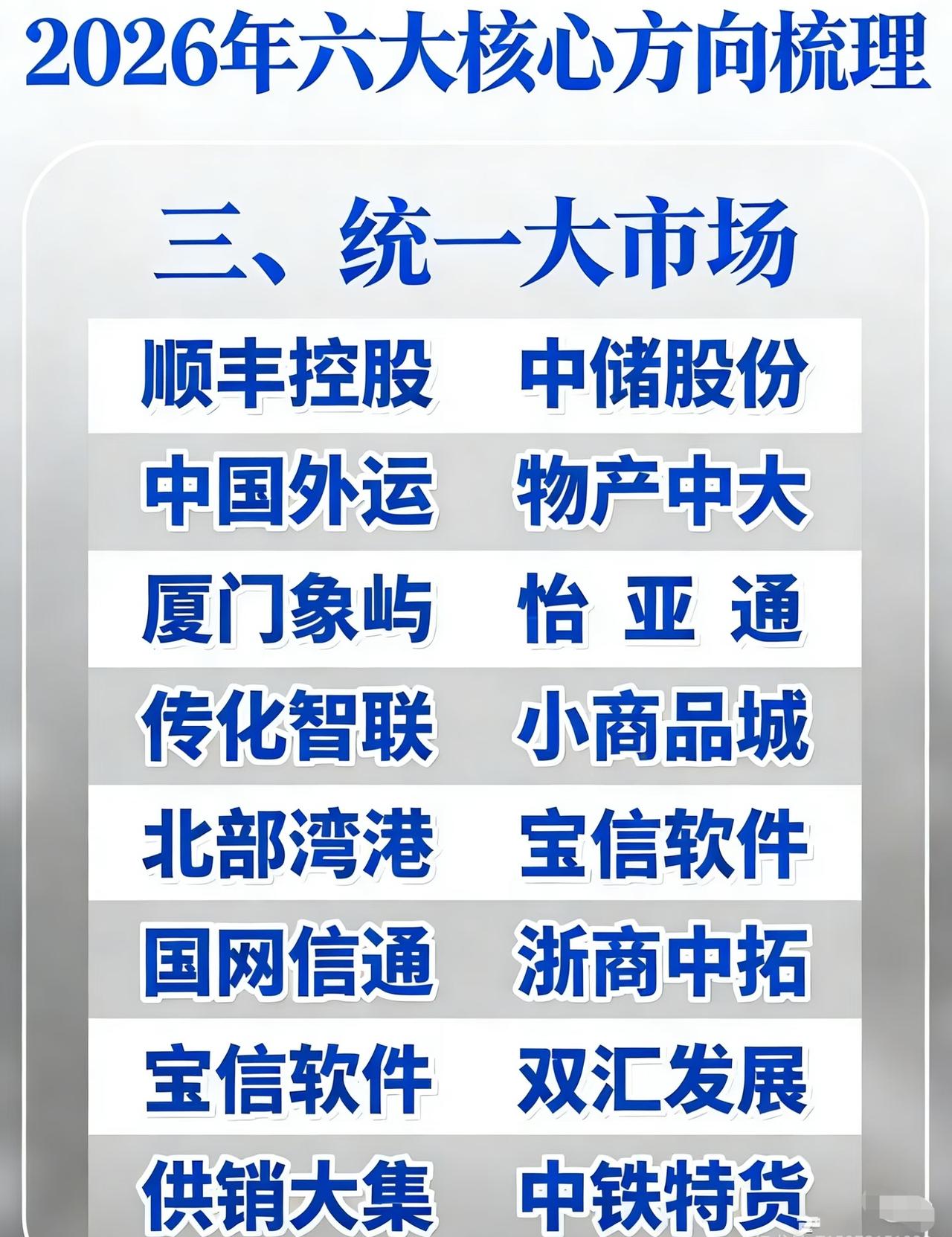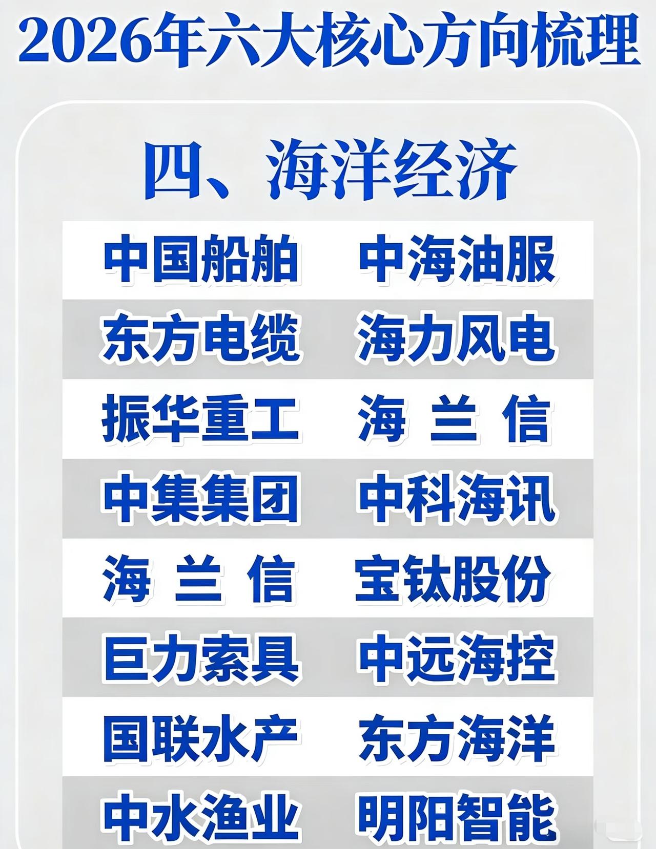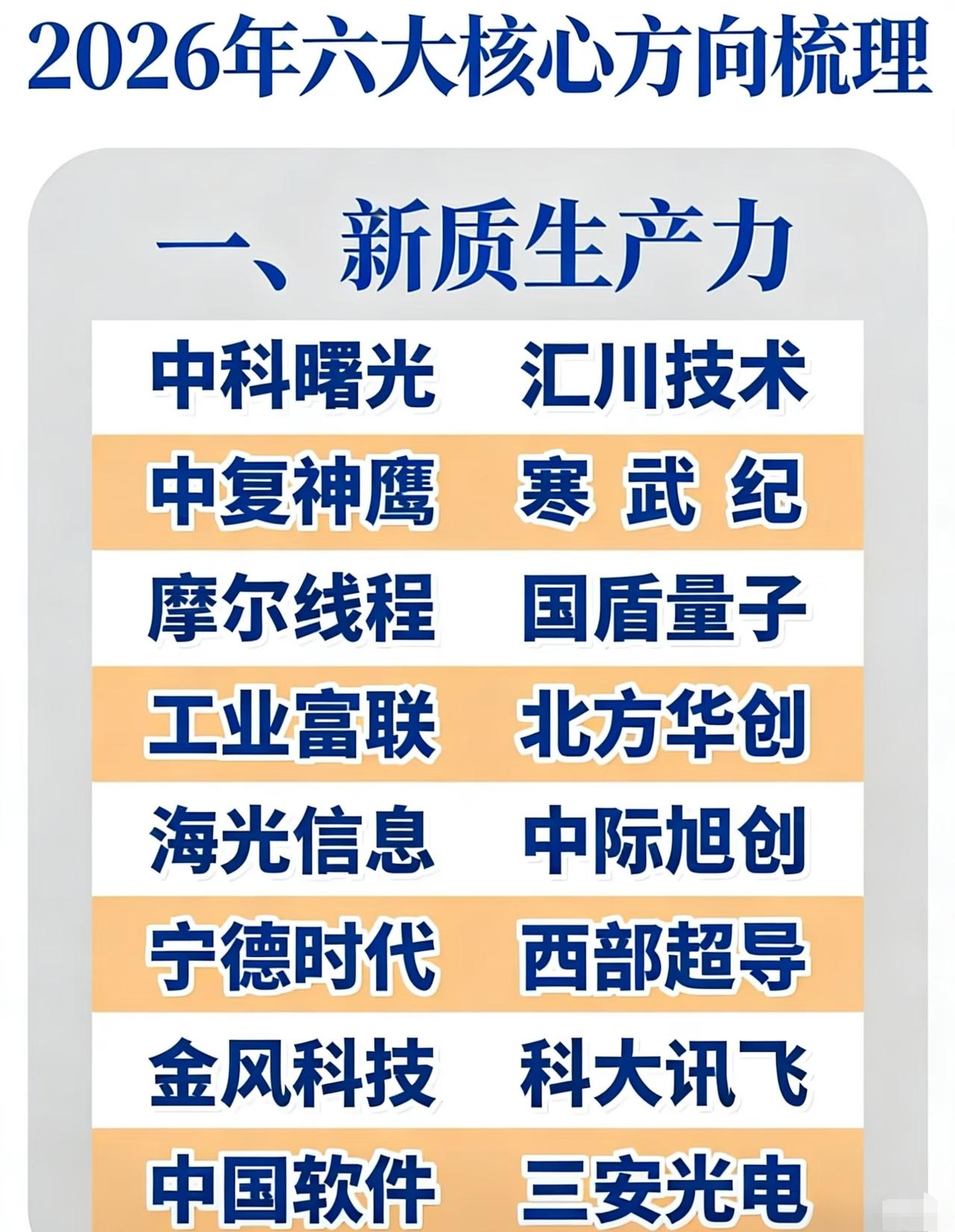 “2026年六大核心方向梳理”包含以下六个方向及相关企业信息: 一是新质生产力,涉及中科曙光、汇川技术、中复神鹰、寒武纪、摩尔线程、国盾量子、工业富联、北方华创、海光信息、中际旭创、宁德时代、西部超导、金风科技、科大讯飞、中国软件、三安光电等企业; 二是国企改革,涵盖中国银河、国电南瑞、中国神华、深振业A、万华化学、东兴证券、信达证券、浙商证券、太极股份、方正证券、中航沈飞、国信证券、中铝国际、物产中大、佛燃能源、中材科技等股票对应的企业; 三是统一大市场,包括顺丰控股、中储股份、中国外运、物产中大、厦门象屿、怡亚通、传化智联、小商品城、北部湾港、宝信软件、国网信通、浙商中拓、双汇发展、供销大集、中铁特货等企业; 四是海洋经济,有中国船舶、中海油服、东方电缆、海力风电、振华重工、海兰信、中集集团、中科海讯、宝钛股份、巨力索具、中远海控、国联水产、东方海洋、中水渔业、明阳智能等企业; 五是房地产,涉及保利发展、万科A、滨江集团、张江高科、招商积余、东方雨虹、东鹏控股、世联行、招商蛇口、陆家嘴、新城控股、中国国贸、南都物业、北新建材、我爱我家、中国武夷等企业; 六是数字贸易,包含跨境通、焦点科技、安克创新、吉宏股份、拉卡拉、长亮科技、四方精创、华贸物流、东方嘉盛、易点天下、华胜天成、生意宝、小红书等企业。