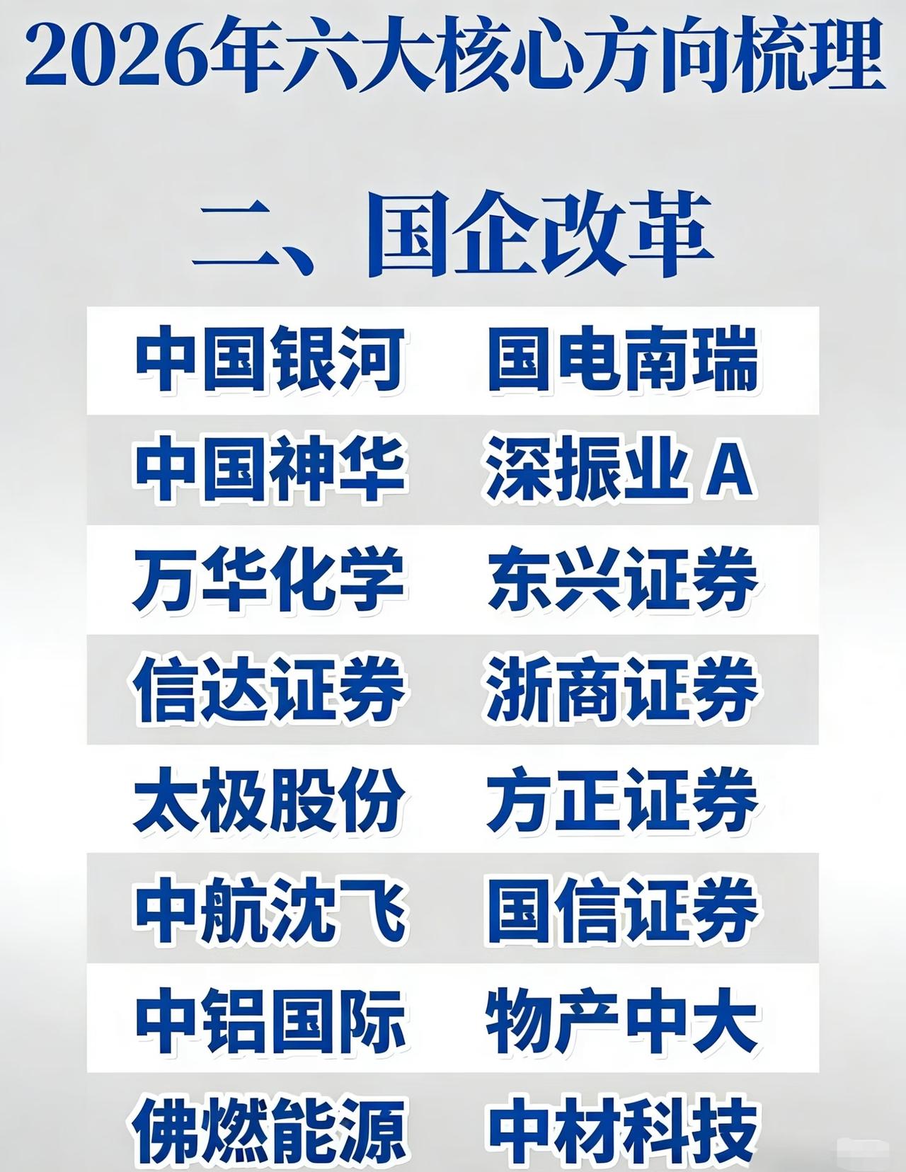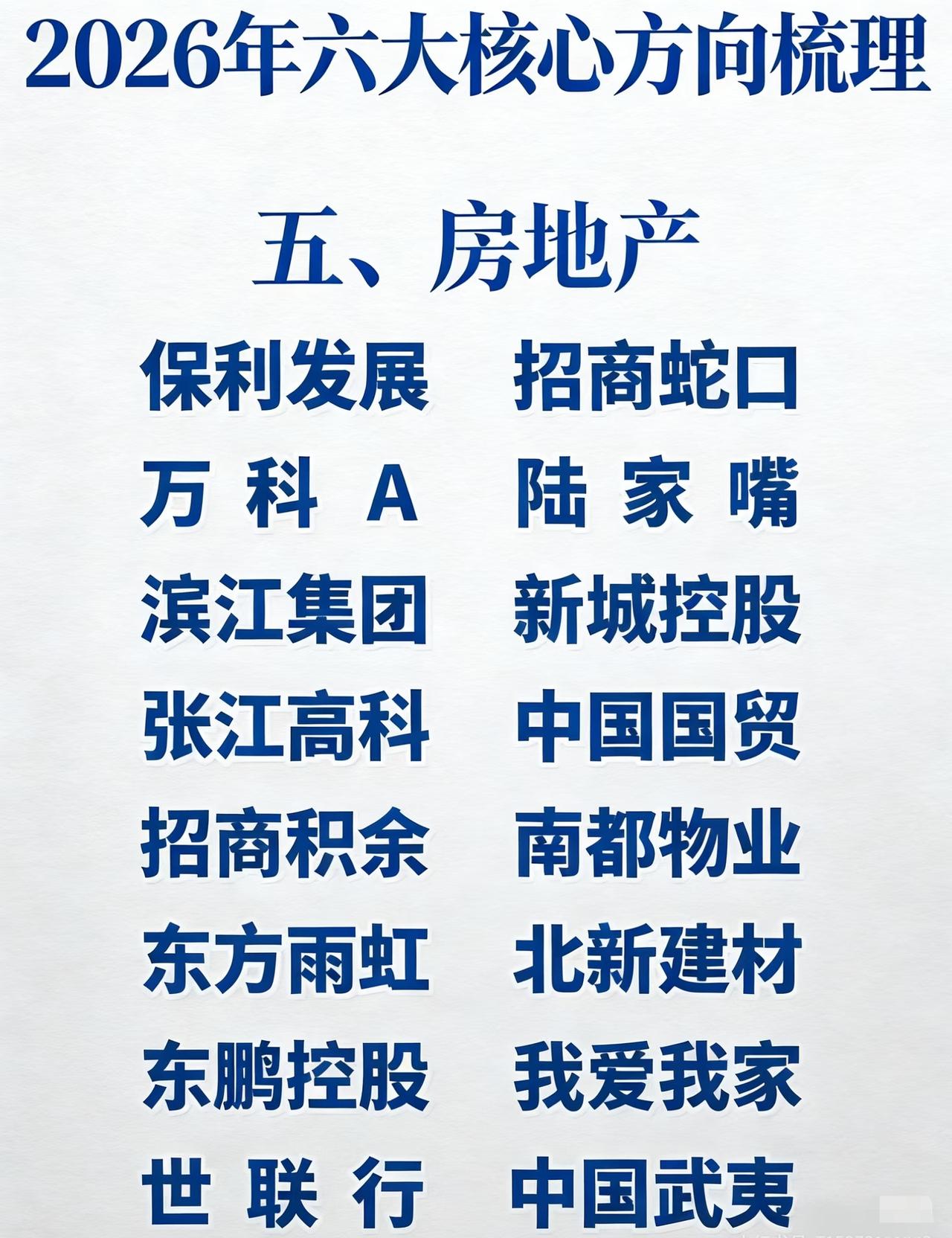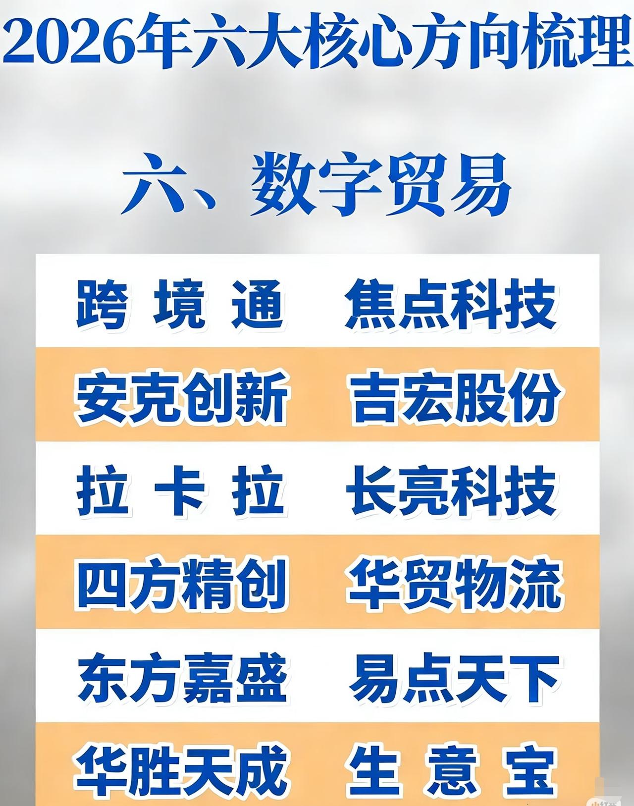 “2026年六大核心方向梳理”包含以下六个方向及相关企业信息: 一是新质生产力,涉及中科曙光、汇川技术、中复神鹰、寒武纪、摩尔线程、国盾量子、工业富联、北方华创、海光信息、中际旭创、宁德时代、西部超导、金风科技、科大讯飞、中国软件、三安光电等企业; 二是国企改革,涵盖中国银河、国电南瑞、中国神华、深振业A、万华化学、东兴证券、信达证券、浙商证券、太极股份、方正证券、中航沈飞、国信证券、中铝国际、物产中大、佛燃能源、中材科技等股票对应的企业; 三是统一大市场,包括顺丰控股、中储股份、中国外运、物产中大、厦门象屿、怡亚通、传化智联、小商品城、北部湾港、宝信软件、国网信通、浙商中拓、双汇发展、供销大集、中铁特货等企业; 四是海洋经济,有中国船舶、中海油服、东方电缆、海力风电、振华重工、海兰信、中集集团、中科海讯、宝钛股份、巨力索具、中远海控、国联水产、东方海洋、中水渔业、明阳智能等企业; 五是房地产,涉及保利发展、万科A、滨江集团、张江高科、招商积余、东方雨虹、东鹏控股、世联行、招商蛇口、陆家嘴、新城控股、中国国贸、南都物业、北新建材、我爱我家、中国武夷等企业; 六是数字贸易,包含跨境通、焦点科技、安克创新、吉宏股份、拉卡拉、长亮科技、四方精创、华贸物流、东方嘉盛、易点天下、华胜天成、生意宝、小红书等企业。