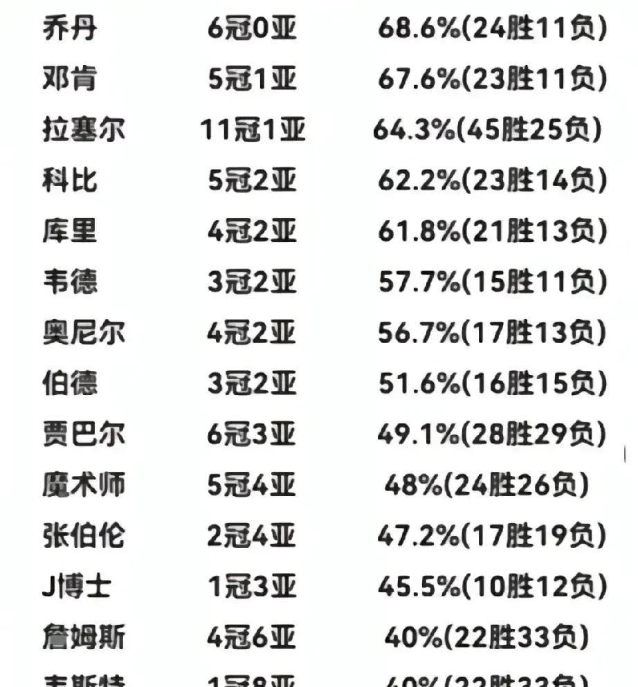 总决赛胜率仅40%?我们都被“总决赛次数”骗了。 乔丹6胜0负,邓肯5胜1负