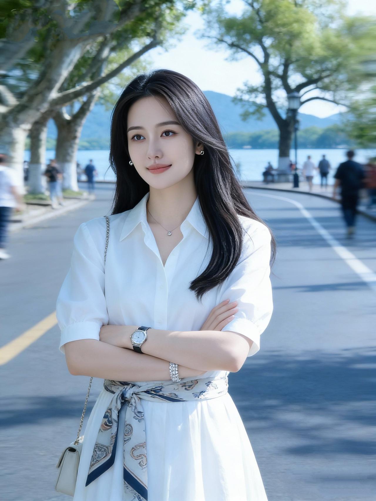 《湖畔白衫》 梧桐的影,斜斜铺在湖岸的路 白衫裁了半缕天光 丝巾系着江南的风 在腰间,打了个温柔的结 她站在光影的分界处 目光越过人群,触到远山的蓝 手表的秒针轻叩 敲碎了湖面晃荡的云影 发梢拂过肩头的风 带着水汽的软 这一刻的静 是喧嚣里偷来的江南片段 赏析:这首诗以湖畔街景为底色,抓取“梧桐影”“白衫”“丝巾”等画面核心元素,用“裁天光”“系南风”的拟人化表达,赋予景物灵动的诗意。将人物的沉静与背景的喧嚣形成对比,“偷来的江南片段”一句,既点出画面里瞬间的美好,也让这份湖畔的悠然有了细腻的情感落点,把实景的清新与心境的恬淡交融在一起。