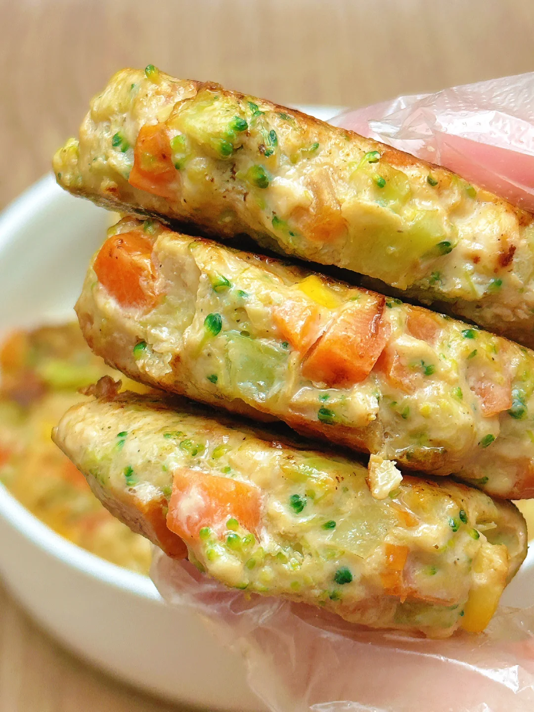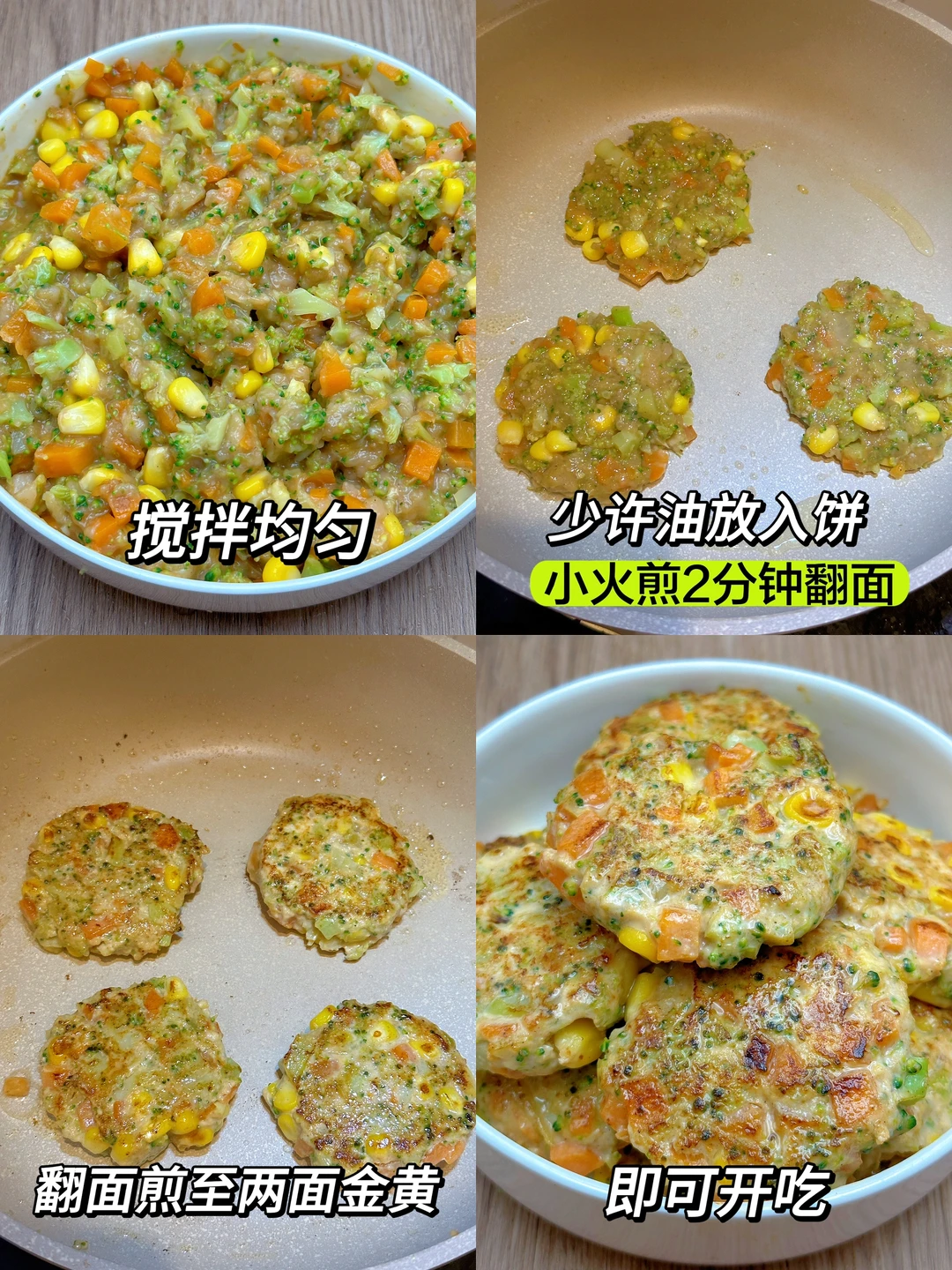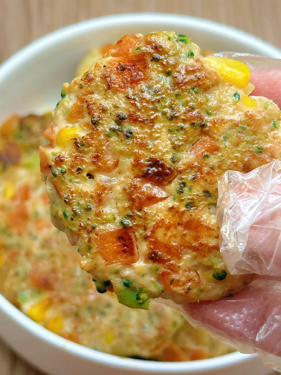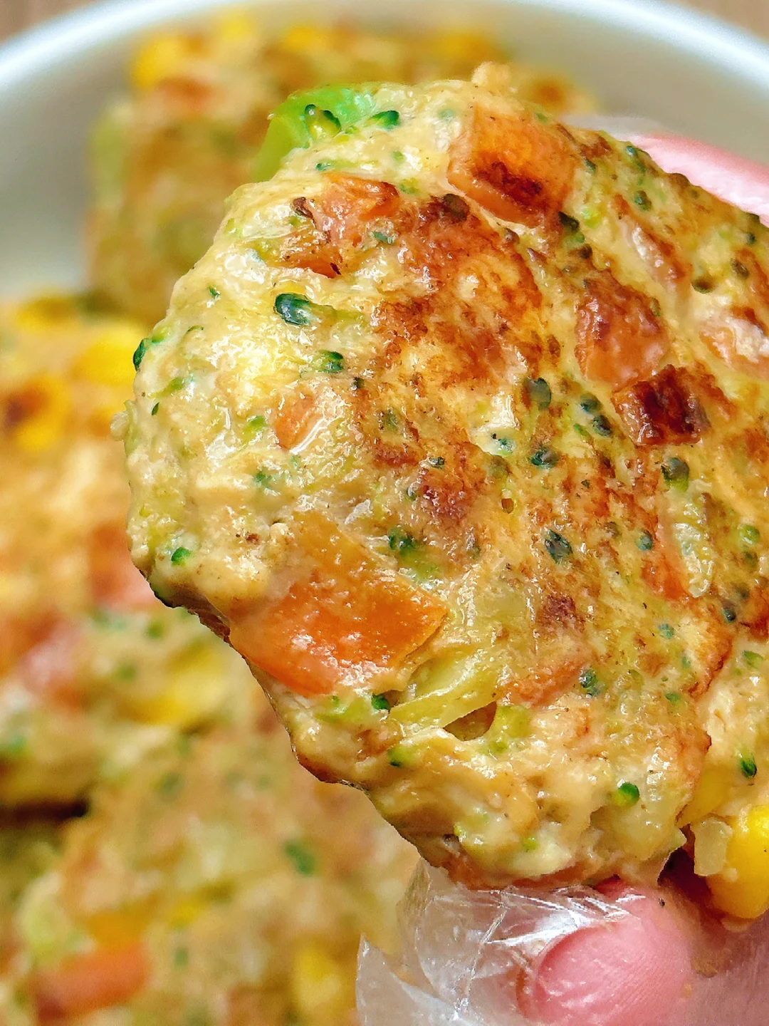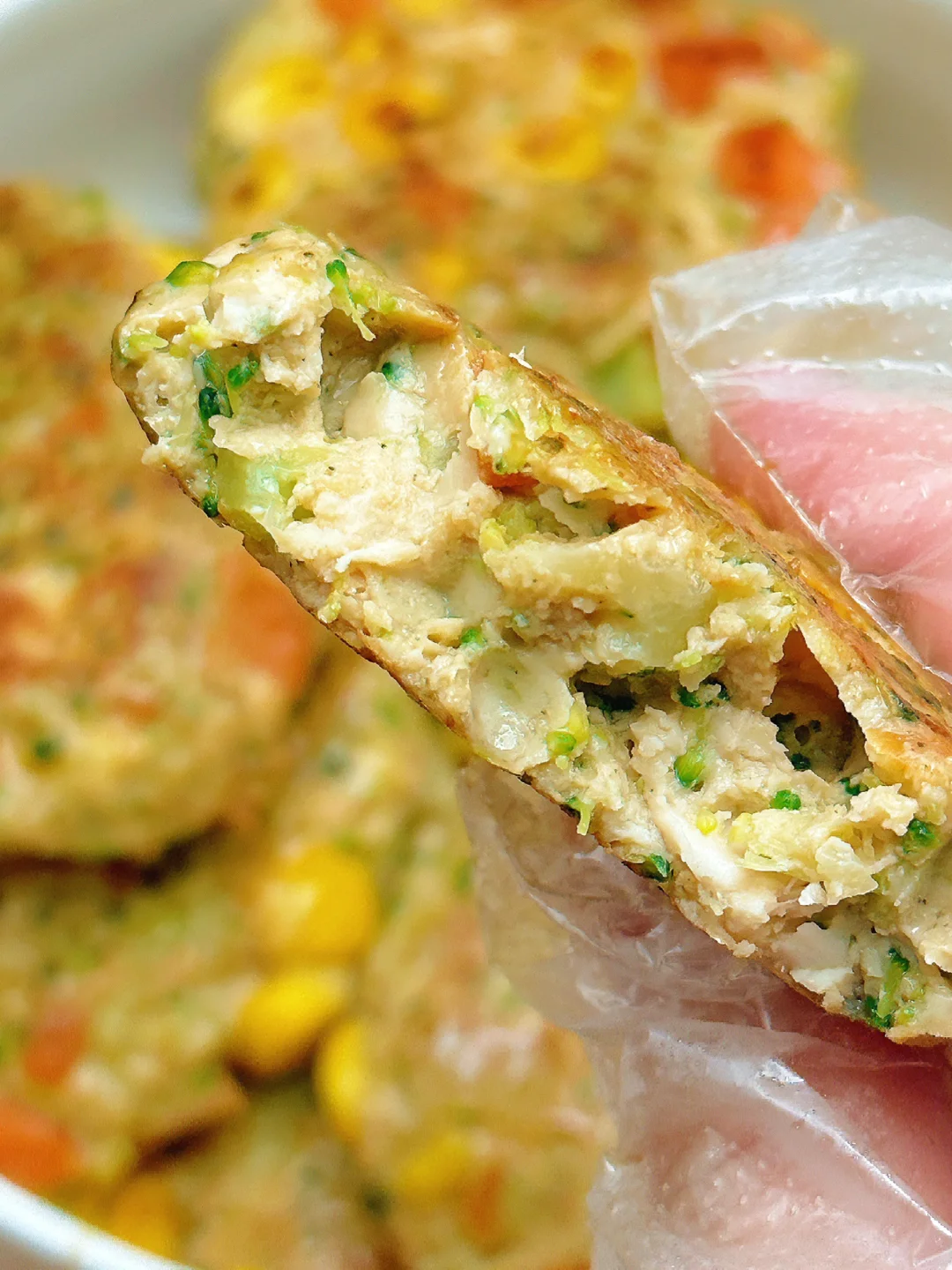 🥗食材:鸡胸肉1块、玉米粒、西兰花、胡萝卜(做了11个饼)