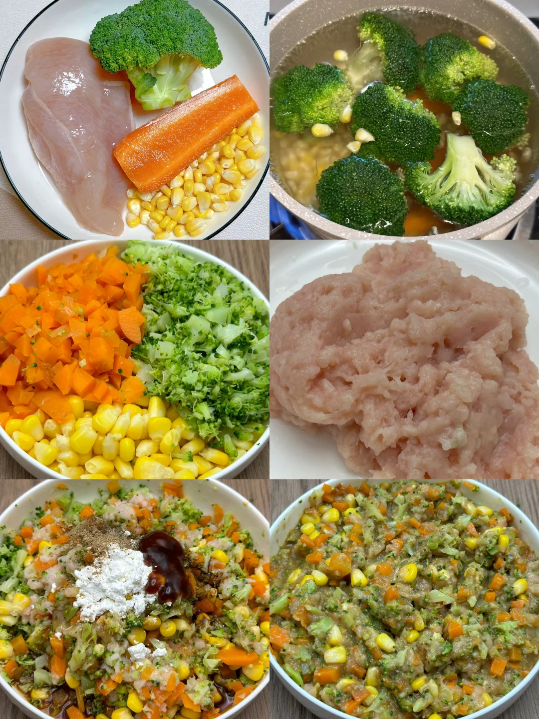 1⃣️胡萝卜,玉米,西兰花煮熟,把西兰花和胡萝卜剁碎,鸡胸肉剁成泥,把所有食材搅拌均匀
