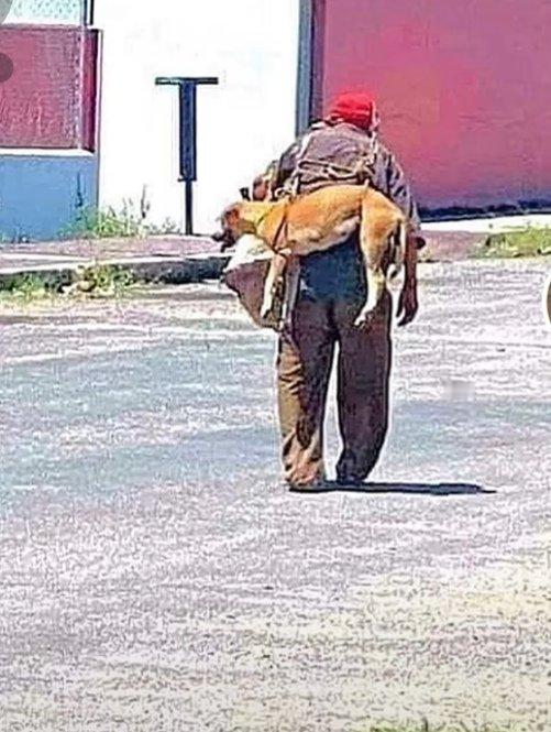 路过的人都在问老人:为何要将狗背在身上?老人说:天气炎热,怕地上的柏油路烫到狗狗的脚。