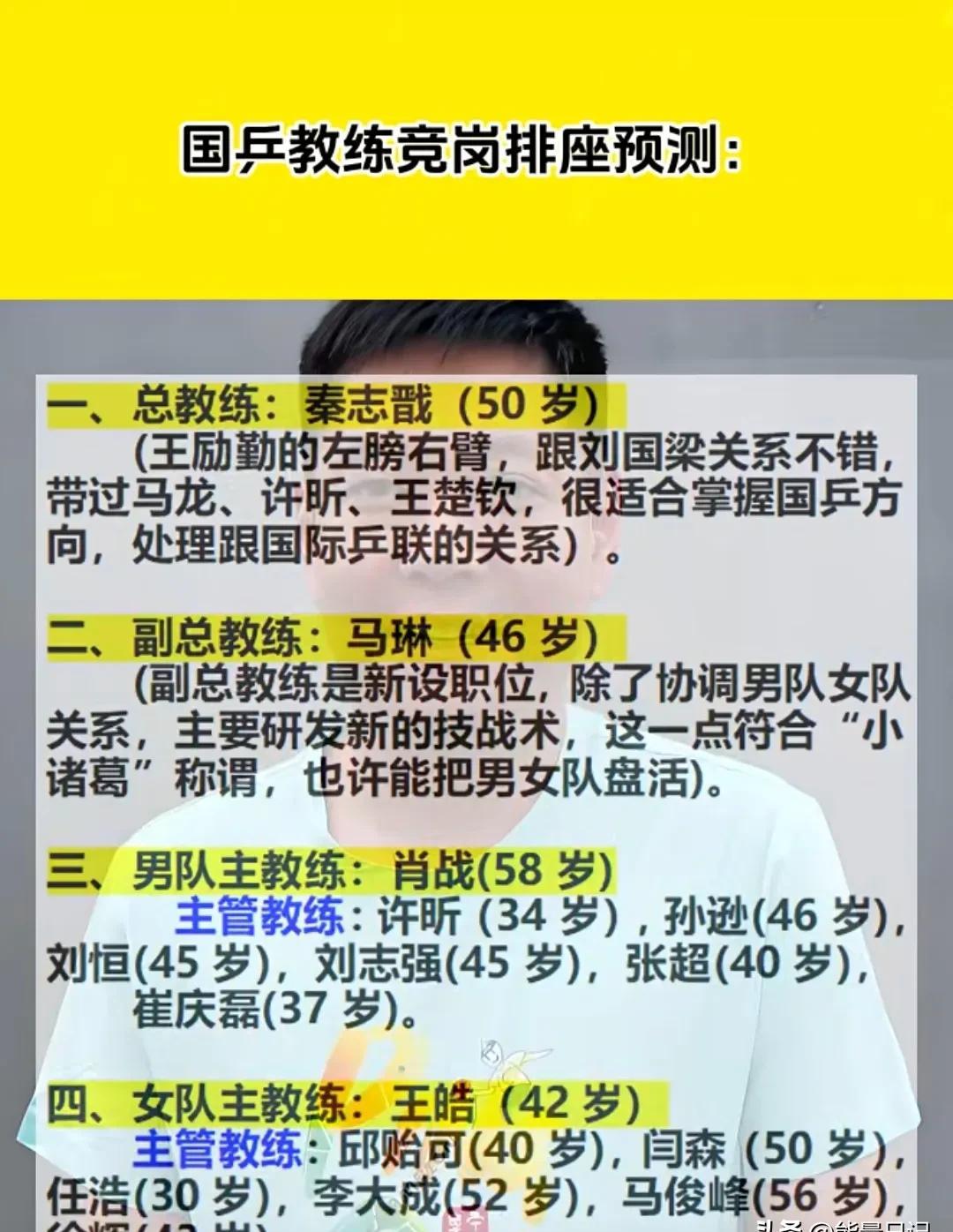 别信那份刷屏的名单。 真正的博弈,在水下。 你看那份名单:秦志戬挂帅,马琳主内,肖战带男队,王皓掌女队。 逻辑很清晰,人脉、风格、梯队,各得其所。 但这只是前戏。 乒协的竞聘函里,藏着两个关键词:“执教能力”与“队伍发展需求”。 这不是分蛋糕,是外科手术。 女队的刀口在“保持”,王曼昱和孙颖莎的统治力已成型,下一任是守成者,更是孵化器。 男队的刀口在“交替”,樊振东之后,断层若隐若现,需要的不只是教练,是能重塑筋骨的铁匠。 所以,谁上谁下,看的不是牌面,是牌桌下最迫切的危机。 名单上的人选都够格,但最终坐上去的那个,必须能回答一个问题:你的刀,对准的是哪一处最深的隐患? 与其猜测谁坐哪个位置,不如看谁能让金牌传承不息。 位置是暂时的,王朝的续航力才是终极考题。