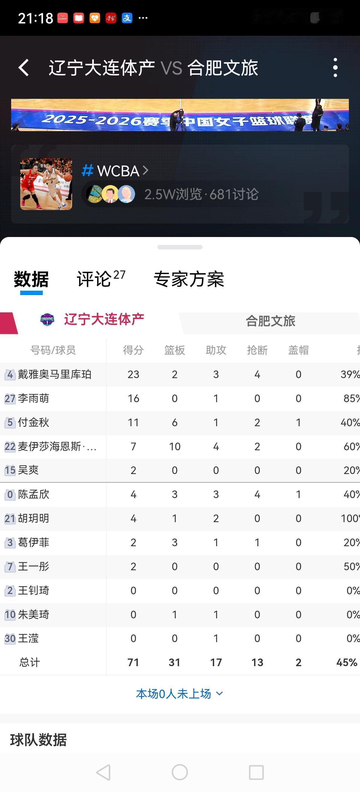 2025 - 2026赛季中国女子篮球职业联赛B组第8轮,合肥文旅女篮客场79 - 71再胜大连文体旅女篮,实现“双杀”,河南队也同样“双杀”对手。 本赛季大连队表现出色,仅首战不敌合肥,还击败过河南、江西等队;合肥状态也不俗,仅负河南和厦门。 这场二番战,开场两队胶着,合肥微弱领先。下半场大连进攻低迷,合肥反击出色锁定胜局。数据上,大连的库珀23分,李雨萌16分;合肥三位外援合砍51分,国内球员得分有限。这比赛真是精彩,期待后续更多对决! 安徽文旅女篮 大连文体女篮