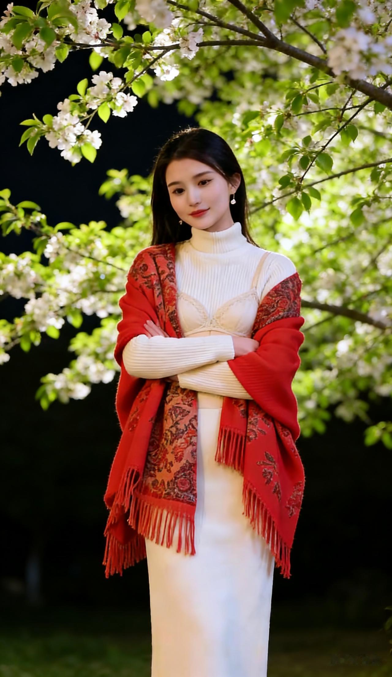 黑夜城墙下,美女身着白色传统服饰,姿态宁静优雅。光影柔和,勾勒出她清丽的轮廓,古