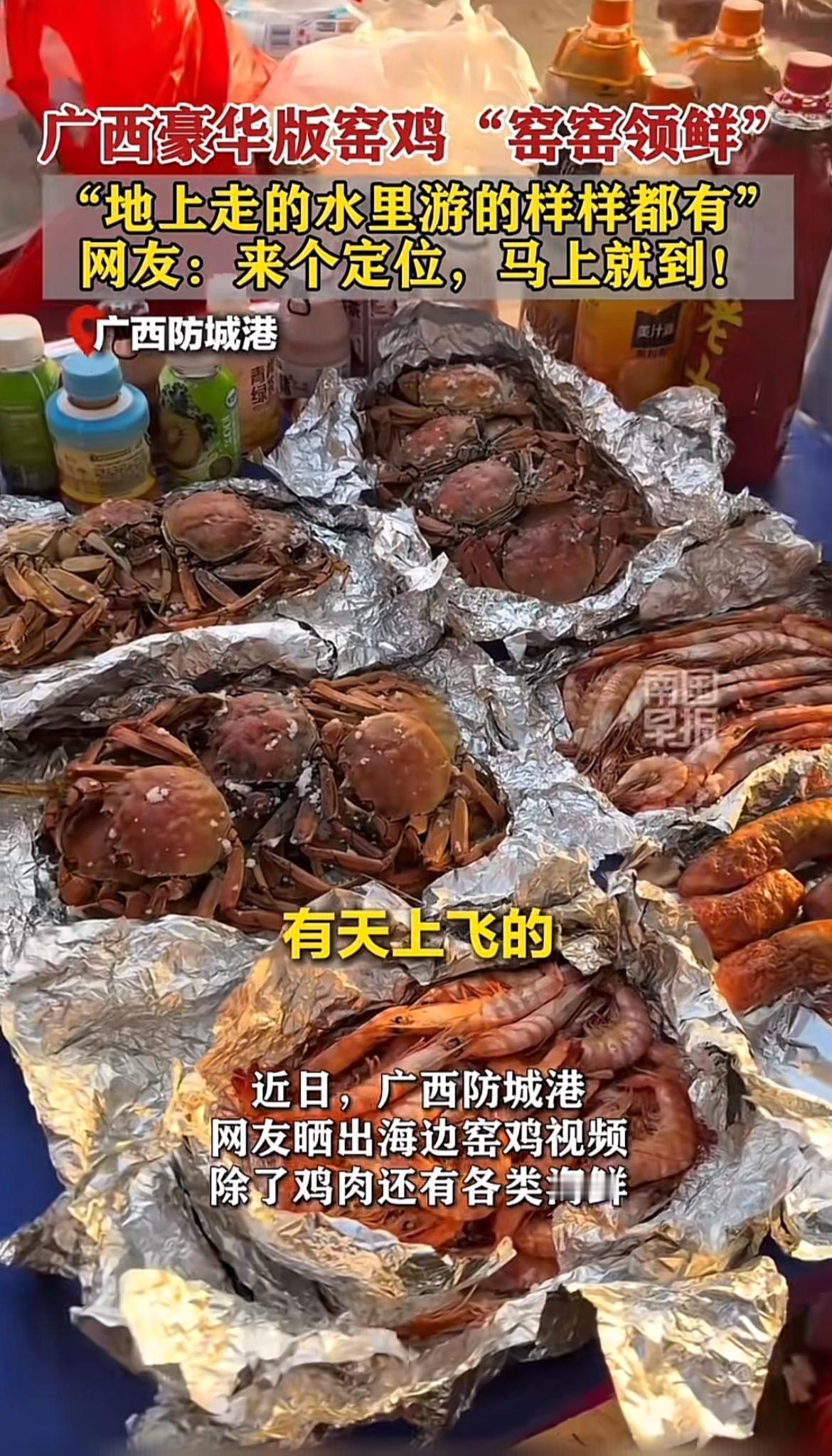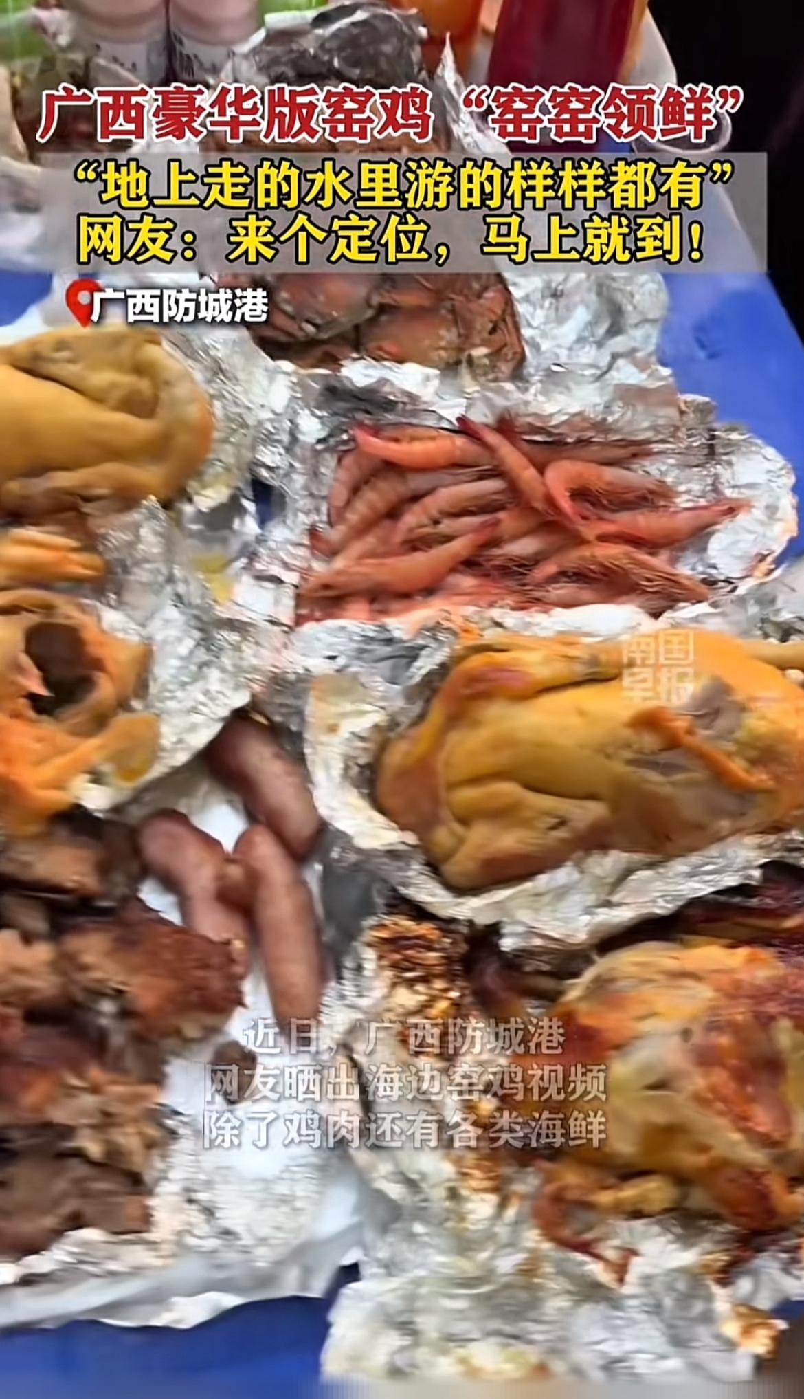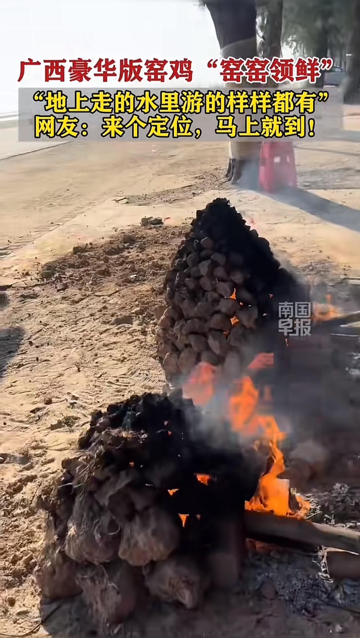广西防城港的豪华版窑鸡“窑窑领鲜”太诱人啦!网友都喊着要定位马上到。 在防城港,冬天窑鸡可是户外活动的“扛把子”。这可是个复杂又隆重的“土木大工程”。砌窑是关键,要在空旷场地用干燥泥块一圈圈堆叠,还得封顶。烧窑时要大火,让泥块都烧得发黑发红,但放柴得小心,不然捅崩窑可就成罪人了。 等窑壁通红,扒出碳灰,把腌制好包起来的鸡,还有红薯、玉米等“地上走的水里游的”食材都放进去,再敲碎泥块覆盖食材。想想那香味,谁能忍住不马上来一份!