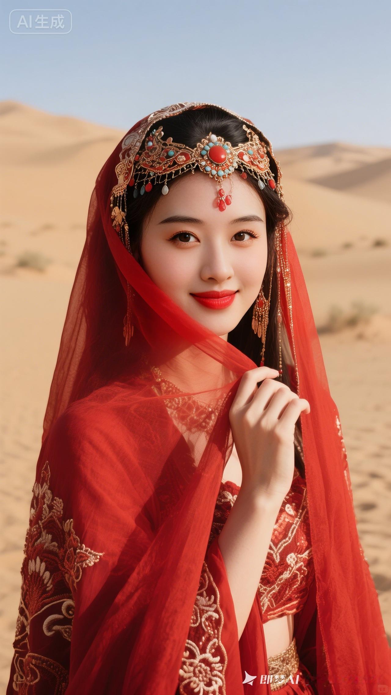 大漠红妆,西域金饰摇曳,红衣长纱轻舞飞扬。她手掩轻纱,回眸浅笑,温柔腼腆,在金色沙海间宛如烈焰盛放的玫瑰。