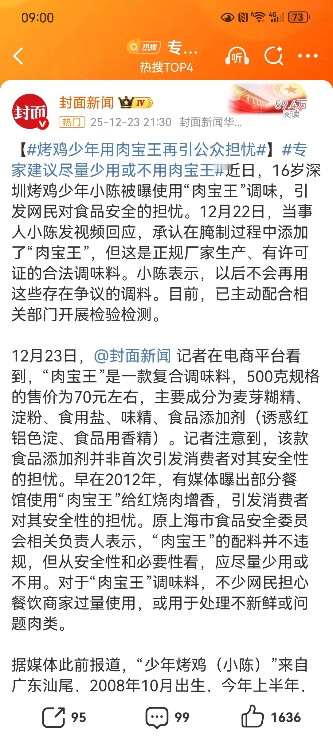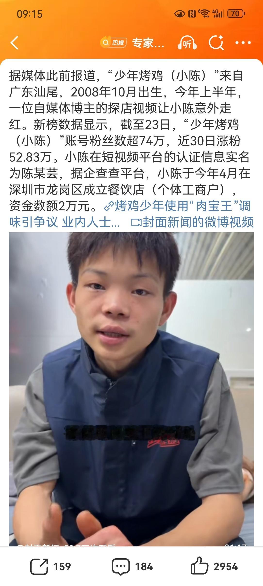 专家建议尽量少用或不用肉宝王【烤鸡少年用肉宝王再引公众担忧】16岁深圳烤鸡少年小陈因使用"肉宝王"调味料引发食品安全担忧。小陈承认添加了这款正规厂家生产的复合调味料,主要成分为麦芽糊精、淀粉、食用盐、味精及食品添加剂。该产品早在2012年就因餐馆用于红烧肉增香而引发争议。专家表示配料虽不违规,但从安全性和必要性看应尽量少用或不用。小陈已配合相关部门检验检测,并表示不再使用争议调料。既然专家建议少用或不用,既然消费者担心商家过量使用或处理问题肉类,为何还允许生产销售?这背后是监管的尴尬:合法但不合理。消费者被迫成为"化学家",用健康为监管滞后买单。食品安全不能只靠"建议",需要更严格的准入标准和监管力度,从源头杜绝"合法但不安全"的添加剂流通。全网热点共创计划