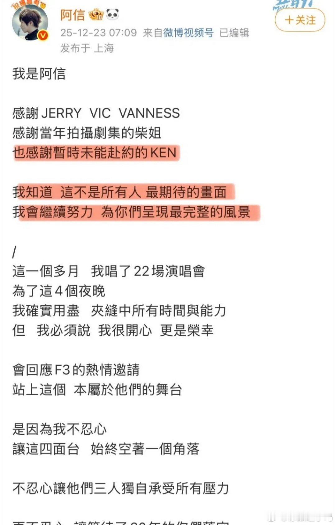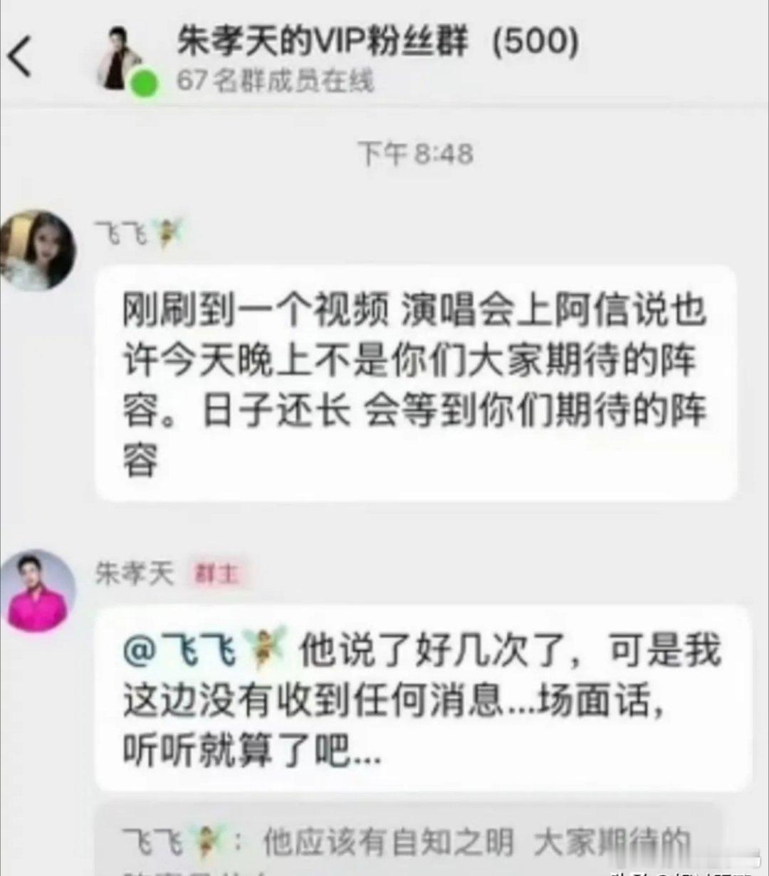 阿信在演唱会上公开感谢朱孝天后,朱孝天在粉丝群里说:“他说了好几次,可是我这边没有收到任何消息,场面话,听听就算了。”
