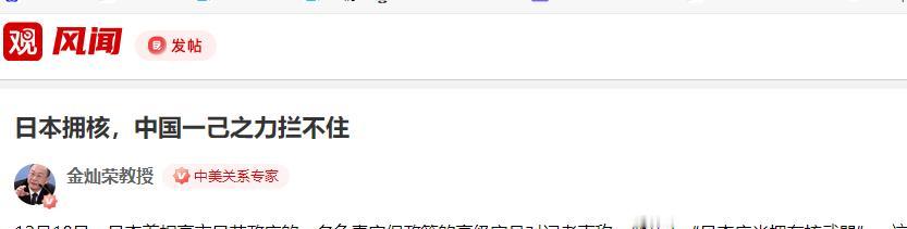 就在刚刚   金灿荣教授宣布了:   日本拥核,中国一己之力拦不住!要知道,这话不是什么“营销号”说的大话,而是由国际关系专家金教授给出的分析!   12月,日本首相官邸高级安全顾问公开抛出“拥核”论调,这一突破战后禁忌的言论,并未引发日本内阁的激烈回应。   相反,阁员们只用几句程式化的表述草草搪塞,这种反常的平静,本质上就是一场底线试探。   他们想做的,就是把“拥核”这个原本不可触碰的话题,悄悄推入公众视野,一点点弱化外界的警惕,最终让这个极端选项,变成可以摆上台面的政策讨论方向。   这种试探绝非空谈,背后有实打实的技术和材料支撑。目前,日本囤积的分离钚已达47吨。这些裂变材料,远远超出了民用核能的实际需求,足够制造大量核装置。   更值得警惕的是,2025年11月,柏崎刈羽核电站在安全隐患尚未完全排查消除的情况下,重启计划依然顺利获批。这一决策,直白地暴露了日本推进核相关计划的急迫心态。   更让人不安的是,日本核安全管理的漏洞正在不断显现。近期,福井县等多地的核设施频繁发生泄漏事故。   一个在民用核领域都频频出现安全问题的管理系统,很难让人相信,它能稳妥掌控风险等级更高的军用核技术。   一旦这些核设施被用于军事目的,技术失控的风险将直接形成一个安全黑洞,不仅威胁亚太地区,更会冲击全球公共安全。   而外部势力的纵容,进一步加剧了这种风险的扩散。为了维持在印太地区的战略布局,美国对日本的约束开始逐渐松动。   具备核投送能力的F-35A战机,已经部署到日本前沿基地。日本方面也在多次军事演习中,反复提及“核共享”方案。   双方一推一就,本质上都是想把核武器,变成地缘政治竞争的筹码。   这种危险动向,必然会引发连锁反应。一旦日本真的迈出拥核第一步,韩国极有可能在民意推动下跟进效仿。   整个东北亚地区,将彻底陷入无休止的武力竞赛,从原本的无核区,一步步变成随时可能引爆的安全热点。   更严重的是,战后形成的国际安全准则将瞬间崩塌,对二战战败国的军事限制,也会彻底失去效力。   金灿荣教授曾明确指出过这种趋势的危险性,日本正在利用当前地缘博弈的空隙,全力推进所谓的“国家正常化”。   但他们必须向世界说清楚,自己到底想做国际和平的维护者,还是成为搅动地区安全的不安定因素。   面对这样一个蠢蠢欲动的邻居,保持高度的防御姿态和足够的警惕,是我们当下必须做出的选择。   安全从来不是靠打破规则换来的,我们始终希望邻国能在国际规则框架内理性行事。如果有人执意要触碰核按钮这个毁灭性的开关,最终的受害者,必然包括他们自己。   面对日本频频释放的拥核危险信号,如何有效筑牢安全防线、遏制风险扩散,值得每一个关注亚太安全的人深思。 信息来源:《日本拥核,中国一己之力拦不住》,观风闻,2025年12月18日。