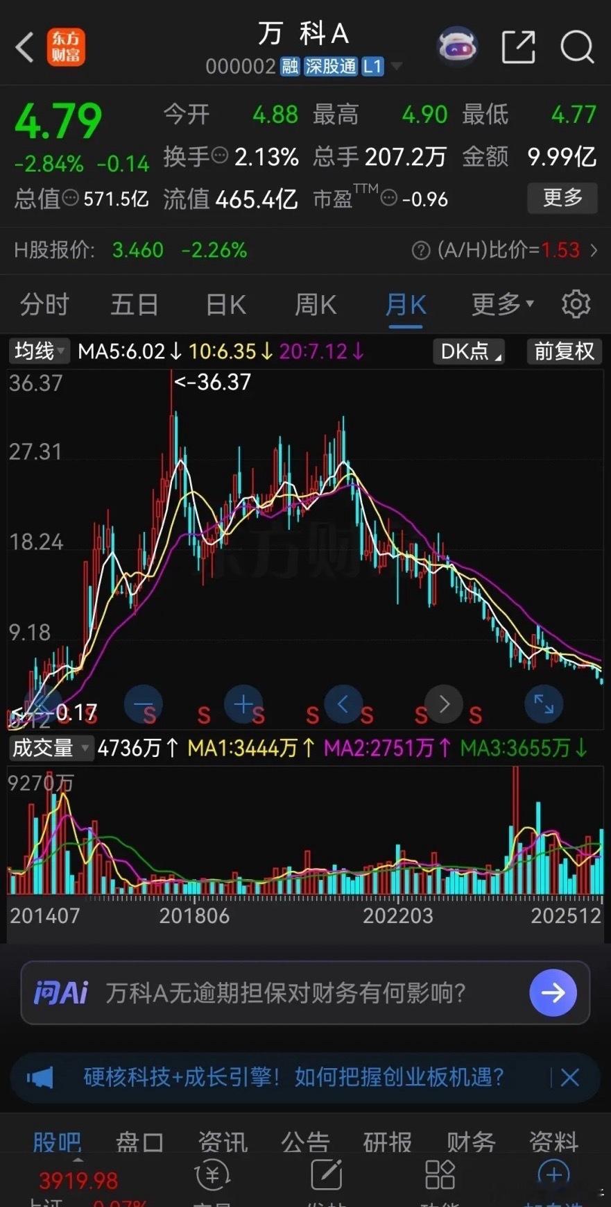 万科这走势让股民们彻底心寒了!大盘今年一路高歌猛进,突破4000点,创出了近十年的新高,而万科的股价今年一路下跌不回头,特别是从11月26日开始连续崩盘式下跌,最低跌到了4.70元,较历史高点36.37元已经暴跌了87%,创出了近十年的新低。前段时间好不容易来了个涨停,最近又连续阴跌两周,截至昨天收盘股价报收于4.79元,距离前低仅一步之遥,马上又要见新低了!现在一直在横盘震荡,股民们越来越没有信心了,如果再次破位大跌,持仓的股民将会彻底绝望,到时割肉盘也将会蜂拥而出!