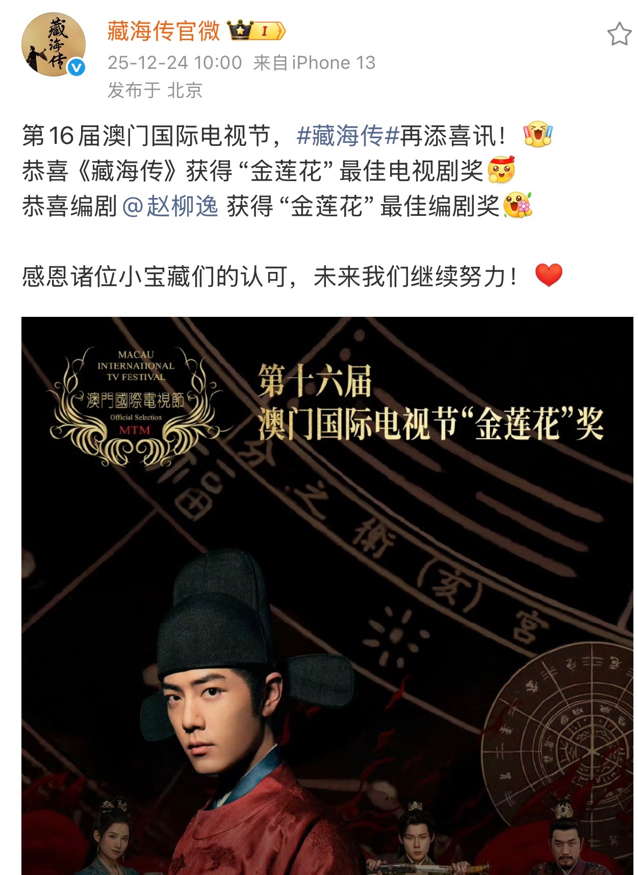 第16届澳门国际电视节,藏海传再添喜讯!恭喜《藏海传》获得“金莲花”最佳电视剧奖!编剧赵柳逸获得最佳编剧奖