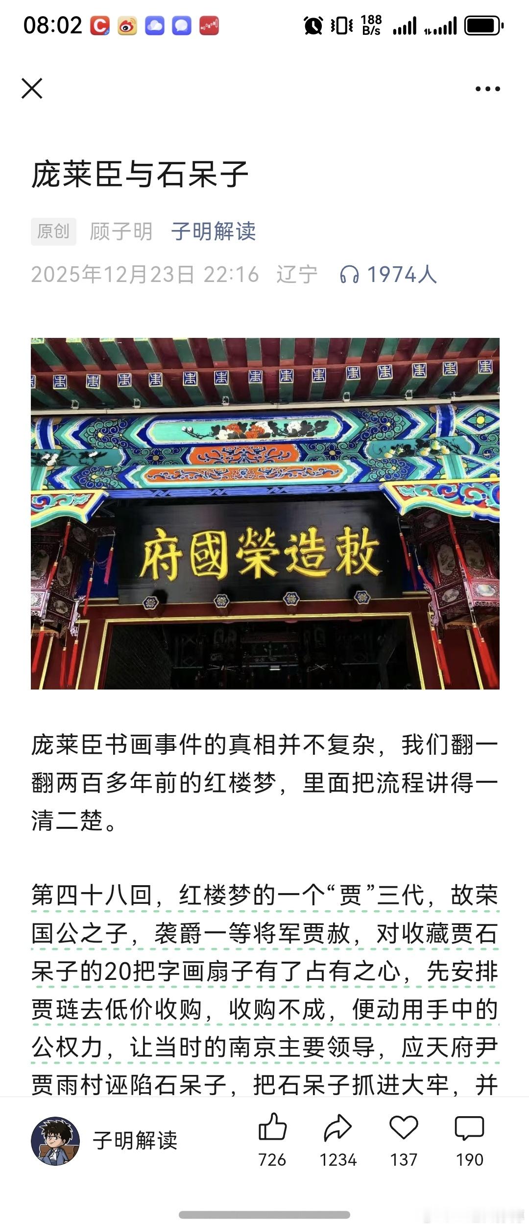 关于最近南京博物院的文物李逵李鬼的舆论事件,顾子明的这一篇算是草蛇灰线的最好了的。“对于京城的古董界以及他们背后的大佬来说,一旦嗅到贾三代贾四代开始将当年家族掠夺之藏品重新投放到市场,也就意味着贾家的权力与宠信已然丧失殆尽,一群闻到血腥味的鲨鱼们很快会一拥而上,开启无情的撕咬。可笑这贾府当年是如何无情掠夺石呆子的家藏,如今自己的后代们也要如石呆子一般走这一遭,这因果报应屡试不爽。”-----分割线------PS:要不为啥说红楼梦是四大名著之首呢。官方通报南京博物院事件