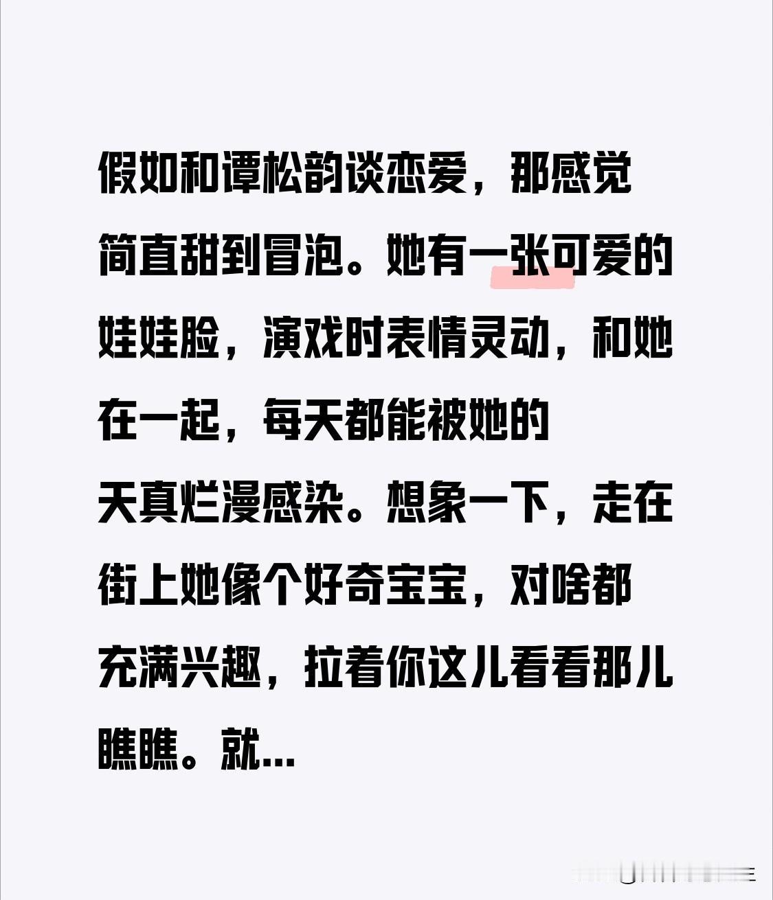 假如和谭松韵谈恋爱,那感觉简直甜到冒泡。她有一张可爱的娃娃脸,演戏时表情灵动,和她在一起,每天都能被她的天真烂漫感染。 想象一下,走在街上她像个好奇宝宝,对啥都充满兴趣,拉着你这儿看看那儿瞧瞧。就像她在剧里和小鲜肉搭戏一样,和她恋爱也会有满满的青春感。她在《旋风少女》里和吴磊的互动俏皮可爱,和她恋爱说不定也会有这种打打闹闹又甜蜜的日常。而且她自然不做作,相处起来肯定特别舒服,就像拥有了一个永远活力满满的小太阳。 谭松韵 谭松韵演技派 明星 🌹🌹🌹🌹🌹🌹🌹🌹🌹