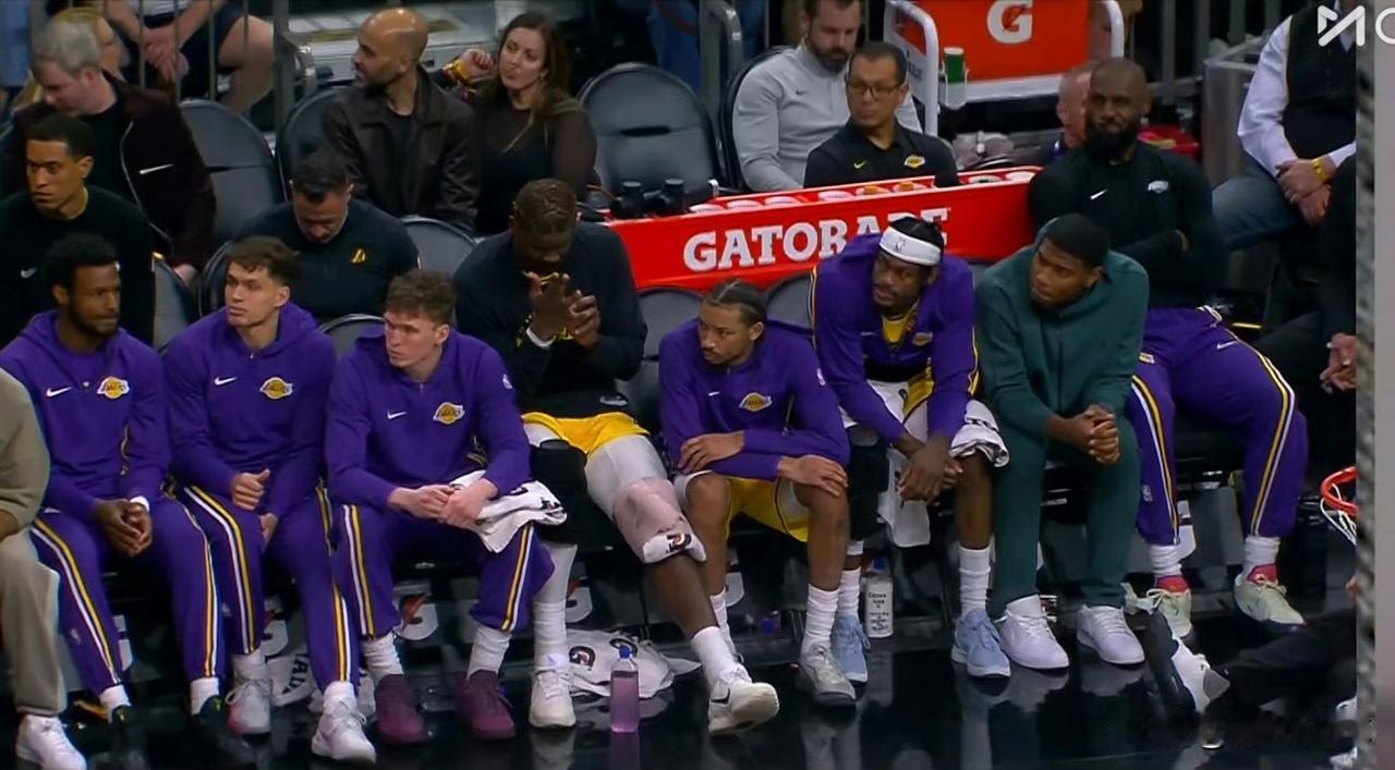输惨了!湖人队替补席一片沉默! 今天客场对阵太阳队的比赛,东契奇、八村塁、文森特因伤缺阵,里弗斯、艾顿迎来复出。赛前,主教练雷迪克还调整了首发阵容,将刚刚伤愈复出的里弗斯下放至替补阵容,将史密斯提上首发,这次大胆变阵也是为了在比赛开局提升防守强度,希望能够赢下比赛。 然而,赛场形势瞬息万变,湖人队的防守依旧是一个最大的问题,让太阳队众将轻松出手三分球,篮板球保护也差劲,分差逐渐被拉开。到了下半场更是毫无还手之力,首节还剩3分13秒之际,湖人队已经落后27分之多,比赛已经基本上失去了悬念。雷迪克将詹姆斯、艾顿等主力球员换下,镜头给到湖人队替补席,真是一片死寂,毫无生机!