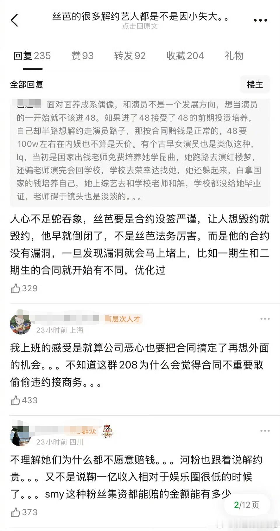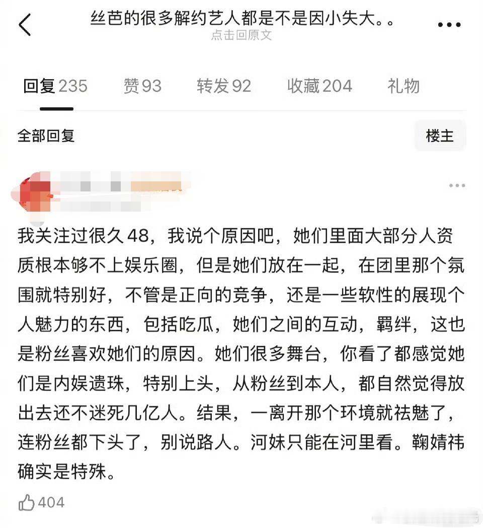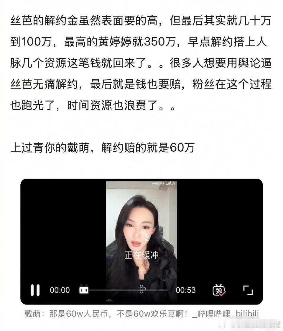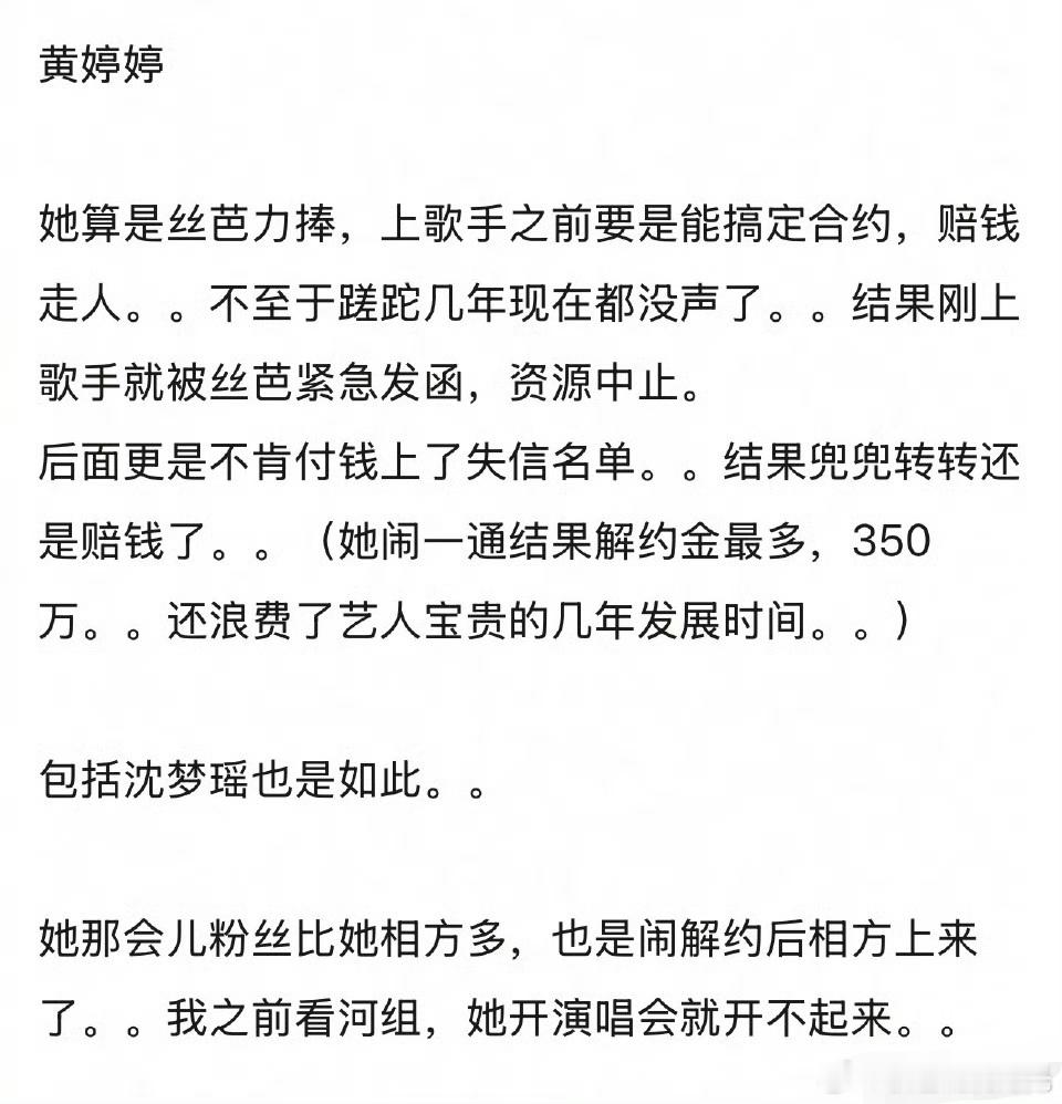 丝芭解约艺人是不是因小失大 有网友发帖说,丝芭很多解约艺人是不是因小失大?赵嘉敏、黄婷婷、沈梦瑶、戴萌等等。网友说,其实丝芭的实际解约金相对于这个圈子并不高,大部分只有几十到100万。公司前期栽培其实花了很多精力,很多解约艺人因为不肯赔钱,导致错过在圈里发展的好时机,相较于前途和那点违约金其实是因小失大。