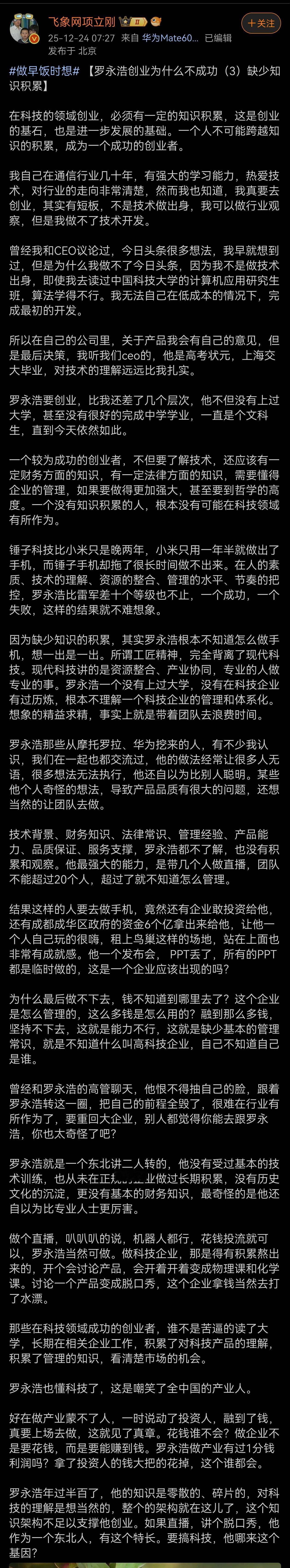 今天刷到一个事儿,给我看精神了。说有个叫项立刚的,要写个系列文章,分析罗永浩为