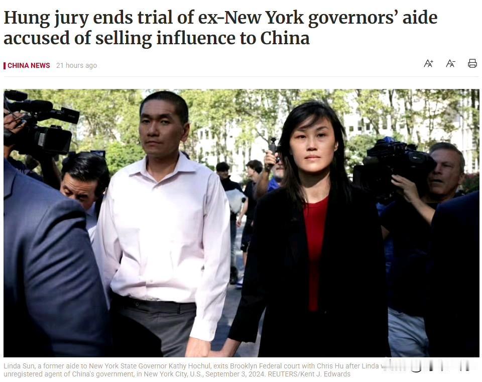 【因证据不充分,美国一桩“中国代理人案件”的审判被法官判定无效】 日前,美国政界和媒体炒作的所谓“中国代理人”案件,以一地鸡毛暂告一段落。 美东时间12月22日,因陪审团无法达成一致,纽约布鲁克林联邦地区法院宣布,纽约州前州长Andrew Cuomo和Kathy Hochul的高级助理Linda Sun(孙琳达)和她的丈夫Chris Hu被控在任职期间“充当中国代理人”一案的审判以陪审团僵局(hung jury)结束,法官宣布审判无效。 陪审团主席告诉地区法院法官,陪审团在对孙女士及其丈夫、共同被告克里斯·胡(Chris Hu)所涉的19项指控进行数日讨论后,仍无法作出裁决。据悉,41岁的琳达·孙被控违反和密谋违反《外国代理人登记法》、欺诈、行贿等多项罪名,43岁的克里斯·胡被指共谋洗钱、欺诈、逃税等。 对于案件流审,检方代表、检察官亚历山大·所罗门(Alexander Solomon)22日向法庭表示,美国政府希望尽快对这对夫妇重新提起审判。法院已将案件进展听证会定于2026年1月26日举行。 这起案件是美国司法部近年来针对所谓“中国在美影响力”展开的最引人关注的诉讼之一,涉及国家安全和外国代理人注册法(FARA),也是少数未通过认罪协议结案、反而进入庭审阶段的案件。 虽然这次审判没结果,但政府很可能重审,案件尚未结束。被告目前仍维持无罪立场。