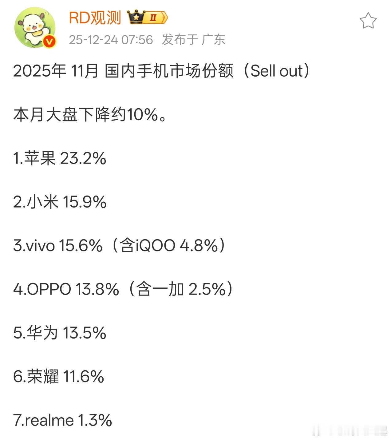 11月份国内手机市场份额,苹果真是遥遥领先了,均价和盈利更是如此