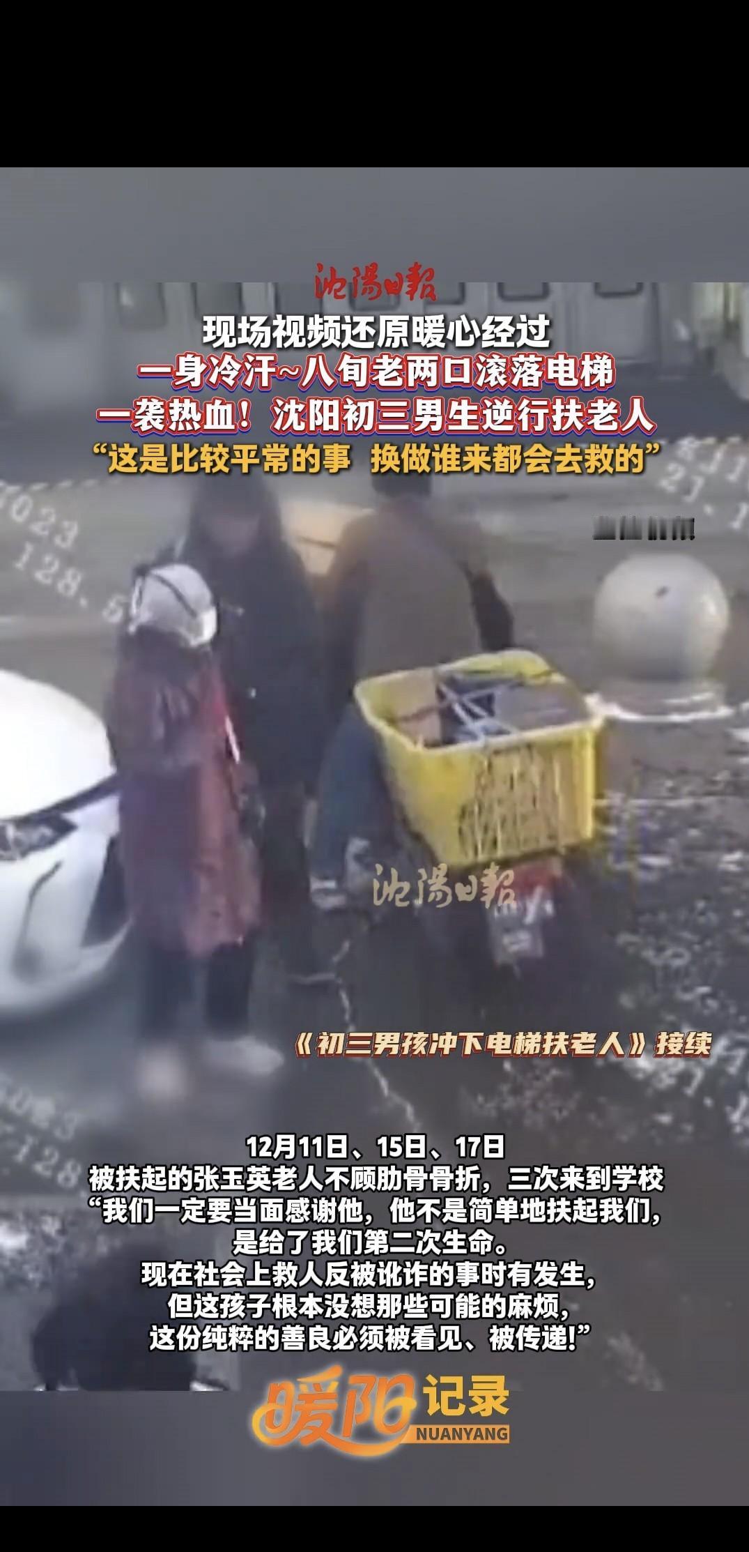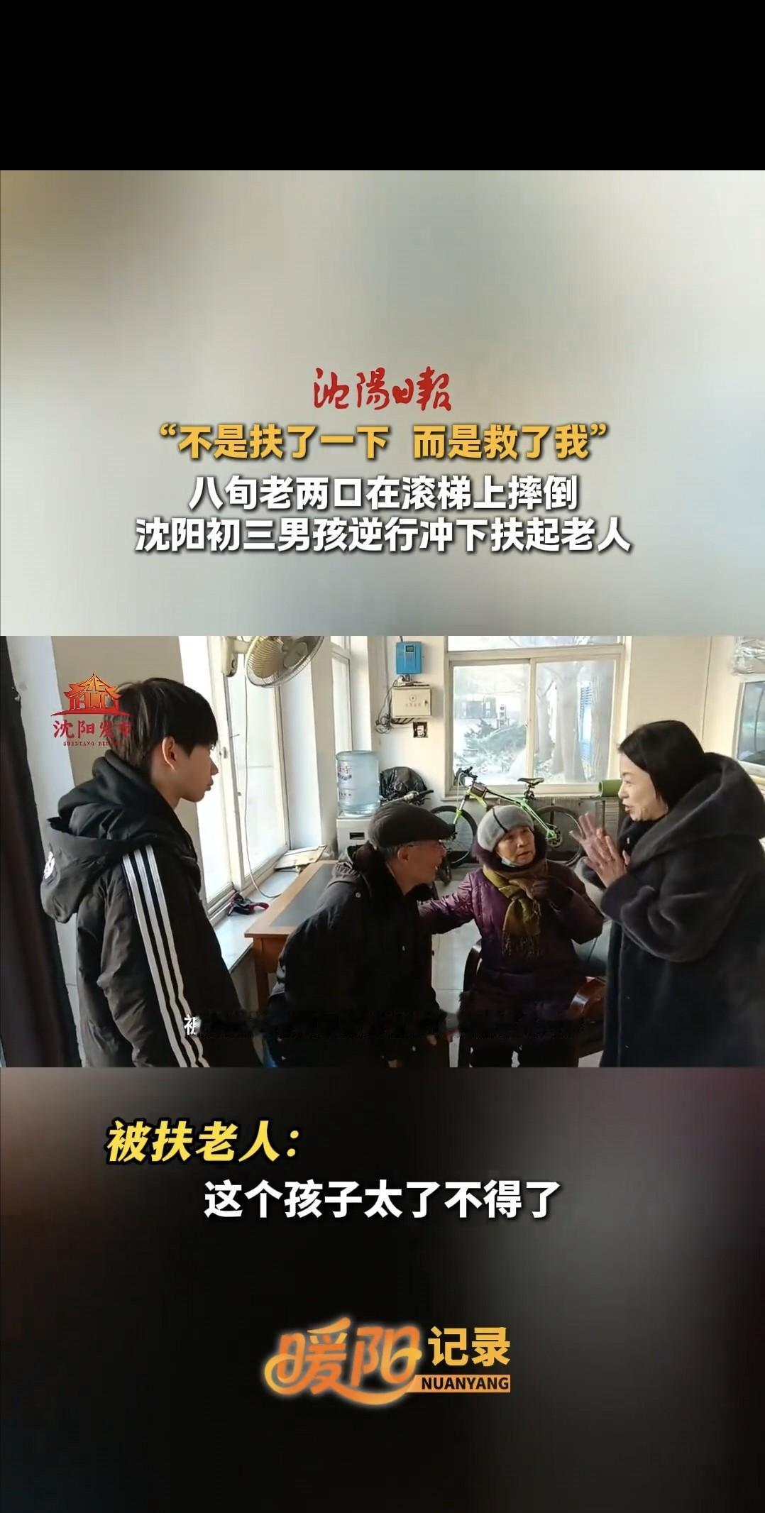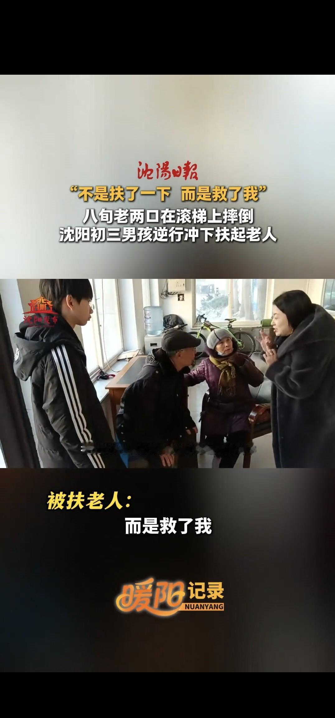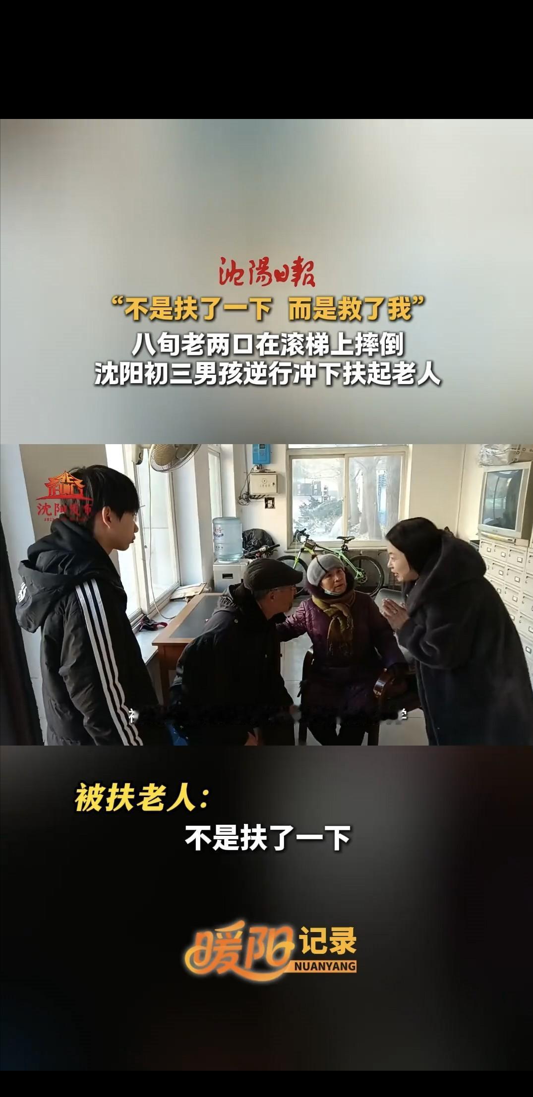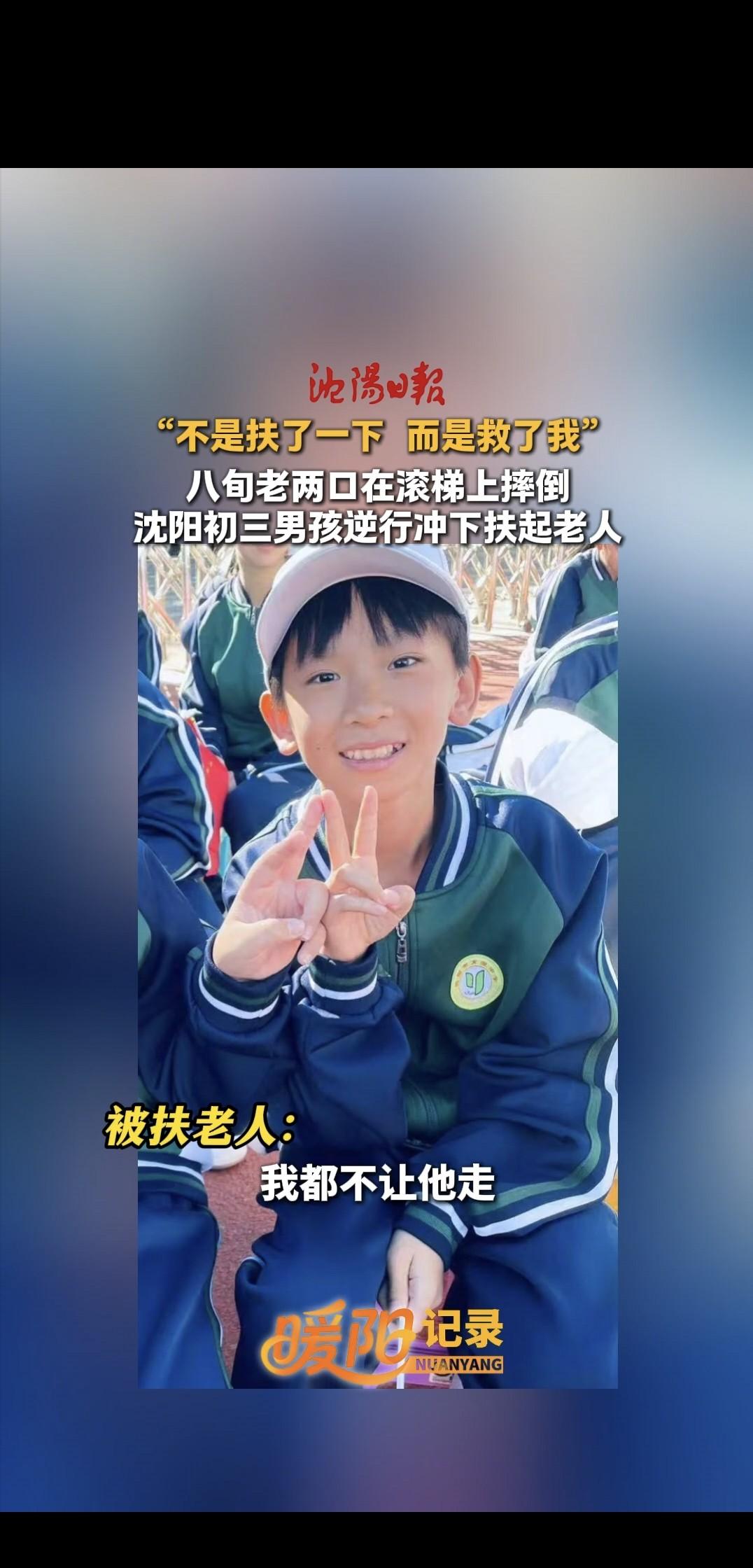 [中国赞]“不是扶了一下!”12月19日,辽宁沈阳,八旬老两口出地铁站时不慎滚落电梯,一名初三男孩迅速逆行冲下将其扶起。老人被扶起后,却说什么也不让男孩走。 (信源:环球网——事发沈阳地铁!两位八旬老人在滚梯上接连摔倒!下一幕全网刷屏……) 寒冬的沈阳地铁里,一段仅十几秒的监控画面,却让无数人热泪盈眶。上行的扶梯突然传来惊呼,八旬老两口重心失衡相继滚落,危急时刻,一个瘦弱的少年身影逆着人流直冲而下,用自己的身体当作“人肉路障”,硬生生挡住了继续下滑的老人。 这惊心动魄的一幕,发生在12月11日沈阳地铁10号线泉园站,而这位挺身而出的少年,是刚因身体不适提前离校的育源中学初三学生高伟峻。 当天午后的地铁车站,人流熙攘却井然有序,上行扶梯平稳运转着。八旬的张奶奶和老伴相互搀扶着踏上扶梯,或许是脚下湿滑,或许是年老体衰,张奶奶突然一个趔趄,身体瞬间失去平衡,整个人向后倒去,连带身旁的老伴也被撞得站立不稳。 两人像断线的风筝一样,沿着扶梯台阶接连滚落,金属台阶的撞击声与老人的痛呼交织在一起,让周围的乘客惊出一身冷汗。 就在这千钧一发之际,刚走出地铁闸机的高伟峻听到了动静。彼时他正因为感冒身体不适,提前向学校请假回家,脸色还有些苍白。 但险情当前,他没有丝毫犹豫,甚至来不及多想,身体已经先于大脑行动起来。他转身逆着上行的扶梯,一步三阶地向下冲刺,单薄的身影在流动的人群中格外醒目。 短短几秒内,高伟峻就冲到了老人滚落的区域。此时张奶奶已经滚到扶梯中段,老伴紧随其后,两人随时可能被扶梯卷入底部,后果不堪设想。 没有时间犹豫,高伟峻迅速站稳脚跟,张开双臂,用自己的胸膛和手臂组成一道坚实的“人墙”。下一秒,滚落的老人就撞在了他的身上,巨大的冲击力让少年踉跄了几步,但他死死咬着牙,拼尽全力稳住身形,终于将老人下滑的势头稳稳挡住。 周围乘客反应过来,合力扶起两位老人并关掉扶梯。被救的张奶奶紧抓高伟峻衣角不放。高伟峻见老人暂无生命危险,羞涩地轻拍老人手背,趁大家照料老人时悄悄离开车站。他或许认为这只是举手之劳,却不知自己的举动避免了悲剧,在寒冬中点燃了温暖之光。 事后老两口被紧急送医检查,结果是张奶奶肋骨骨折,爷爷手臂受伤。医生看检查报告感慨,幸好有人及时阻拦,否则任由老人滚到扶梯底部,可能造成颅内出血等致命伤害,后果不堪设想。 躺在病床上的老两口惦记着救他们的少年,称不能让好孩子默默无闻,要当面致谢。伤势稍稳后,老两口便开始寻人。 他们只记得少年穿校服、戴校徽,却记不清学校名称。凭借这仅有的线索,两位老人忍着伤痛、拄着拐杖,多次往返于医院和地铁周边学校。三次尝试后,他们第三次来到育源中学时,终于在学校帮助下找到了名叫高伟峻的少年。 见到救命恩人高伟峻,老两口激动落泪,颤抖着从包里拿出装2000元现金的红包执意相谢。高伟峻见老人眼神诚恳,当面推脱不开便暂时收下。 回家后,他第一时间告知父母和老师此事,在家人支持下,第二天一早他带着红包回学校,亲手将钱还给老人家属,并再三表示救人是分内之事,不能收钱。 曾几何时,“扶不扶”的顾虑让多少人在险情面前犹豫不前,让多少善意在权衡中消散。但高伟峻的逆行冲刺,用最纯粹的本能打破了这份冷漠的壁垒。 而两位老人执着寻恩的坚持,更是用行动守护了善意的尊严。少年不问回报的挺身而出,老人跨越山海的执着致谢,这场双向奔赴的善意,像一股暖流,淌过寒冬的沈阳街头,也淌过无数人的心田。 在这个快节奏的时代,我们总在感慨人情冷暖,但总有这样的瞬间,让我们重新相信善良的力量。高伟峻用瘦弱的身躯撑起的不仅是两位老人的生命,更是一份沉甸甸的社会责任与担当;老两口用三次奔波的执着,诠释了“滴水之恩当涌泉相报”的传统美德。 它告诉我们,善良从未缺席,温暖始终都在,而每一个勇敢伸出援手的人,每一个认真守护善意的人,都在为这个世界增添温度。这个冬天,因为这场双向奔赴的善意,沈阳不再寒冷,人心更加温暖。