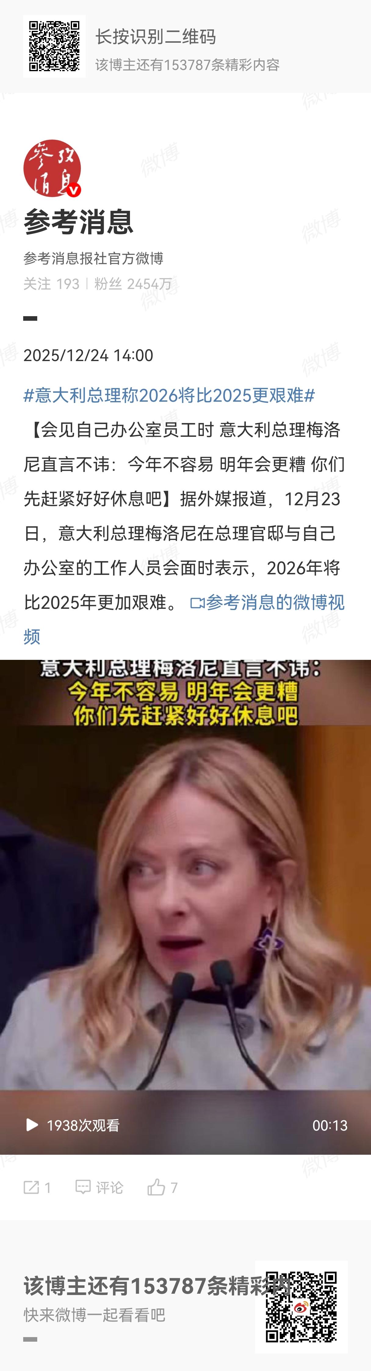 12月23日,意大利总理梅洛尼建议总理府员工们在即将到来的节日假期好好休息。梅洛尼说明年会更艰难,休息好了才能应对明年的挑战。说实话,我是因为这件事情,开始转变对梅洛尼的看法,甚至对她产生好感,不是因为她这次没翻白眼,也不是因为她这次没有胡乱抛媚眼。是觉得她比起很多欧洲领导人更务实,更接地气,更考虑本国人的利益。相比欧洲其他女政客,比如冯德莱恩,比如卡拉斯,看问题有一种“旁观者清”的觉悟。