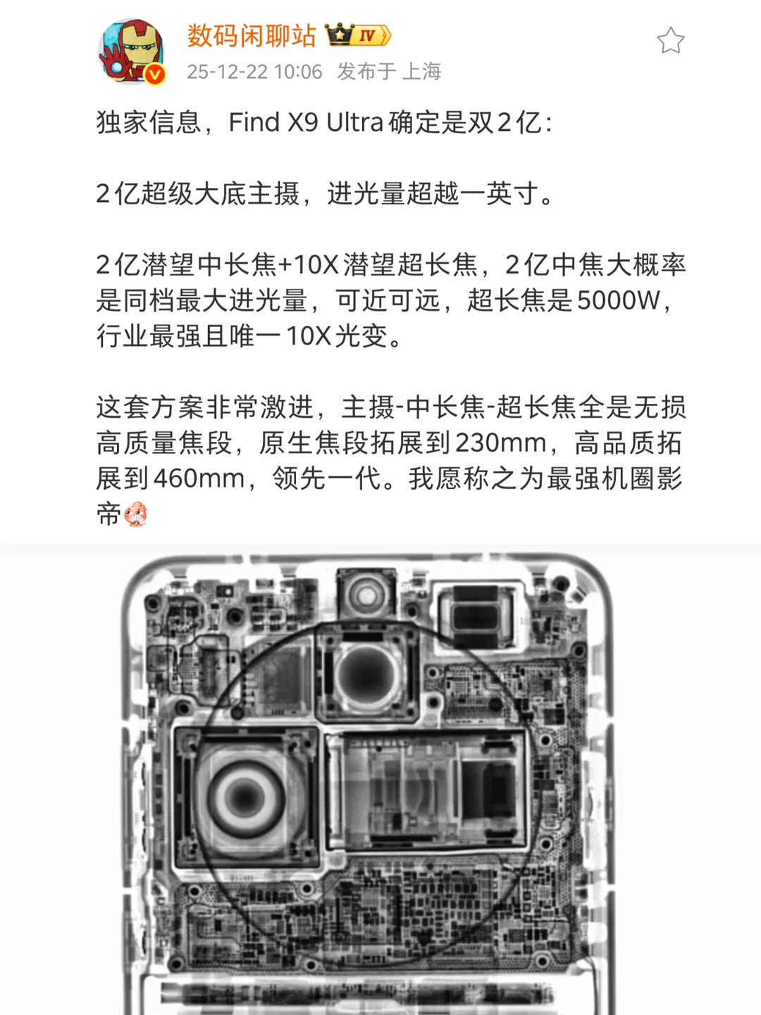 没想到小米17 Ultra来的那么早,配置真心不错,长焦表现大幅增强,外观设计上也有大改,史上👄强徕卡影像稳了吧。 其他家看到小米预热,我感觉纷纷都加紧了曝料,从数码闲聊站大佬来看它放出OPPO Find X9 Ultra的信息还挺多。它表示这机子用了双两亿像素镜头,主摄2亿像素+中长焦2亿像素,还有一颗长焦和超广角都是5000万像素,镜头直接堆出了5亿像素,别忘了还有一颗丹霞色彩还原镜头! 没错,OPPO Find X9 Ultra依旧是双潜望长焦设计,一颗是2亿像素的中长焦,还有一颗则是行业唯☝🏻的10X光变的超长焦,这套组合覆盖全焦段,10倍光变那不妥妥的新一代演唱会神器?再搭配增距镜,不敢想了😂 可以确定的是,它比那些单2亿镜头的手机强,同时在望远超长焦画质上又比双2亿的好,因为X9U的那颗10X光学变焦镜头就是负责望远的。 对比一下现在的Find X8 Ultra,可以说Find X9 Ultra从性能、影像,到屏幕、电池续航都有很大升级,要是价格能稳住的话,那可太有竞争力了!