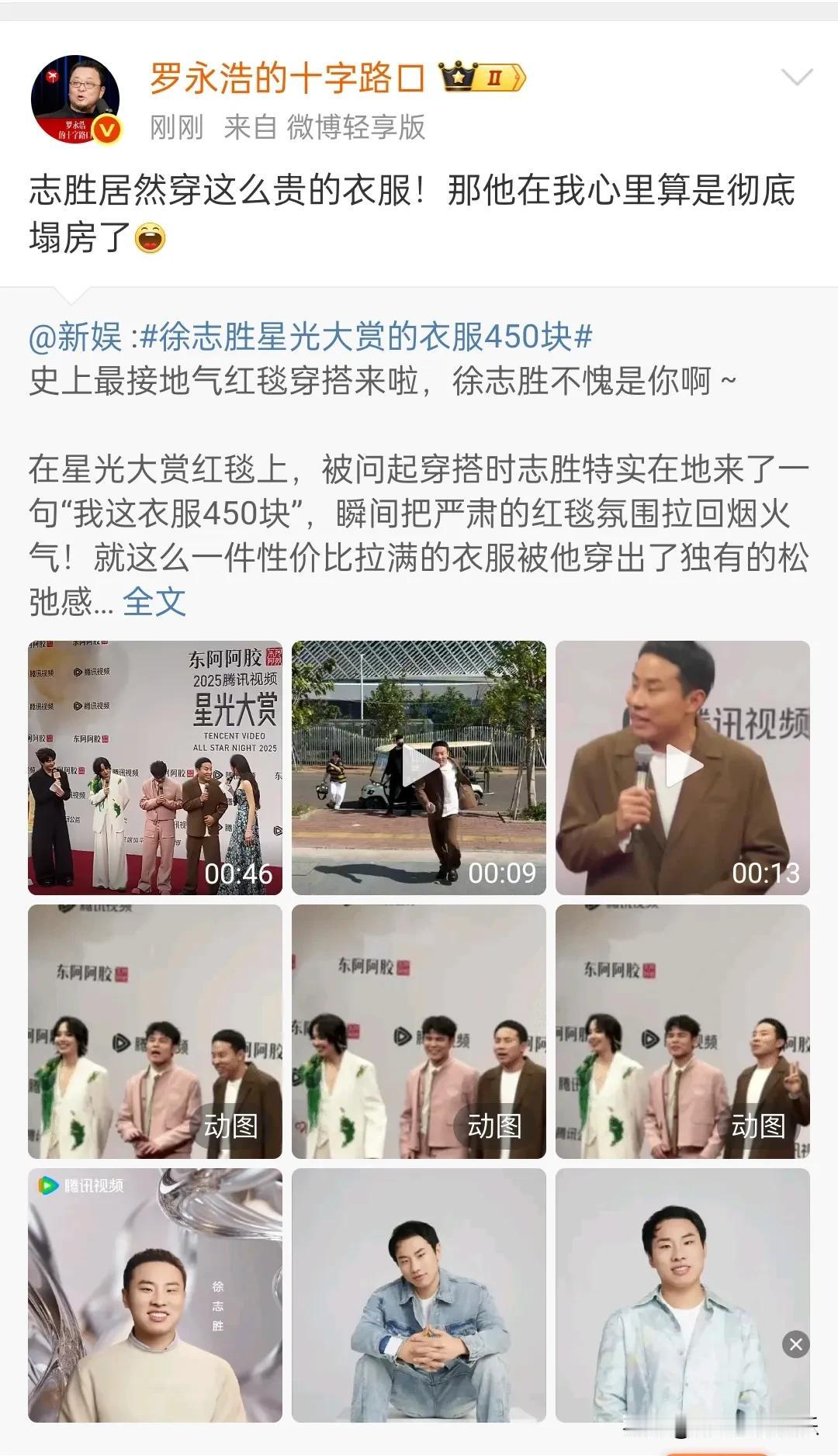 徐志胜穿450块的旧衣服走红毯,被罗永浩说塌房了,看来罗永浩的衣服估计都没有450块钱。 明星衣服动不动就上万,徐志胜穿几百块旧西装走红毯确实是很节约,但在罗永浩眼里,450都多了,他的衣服才几十一百多。 明星也有节约的,孙俪一件羽绒服穿了16年,刘涛一条围巾戴了九年,物尽其用才是有福报的人。