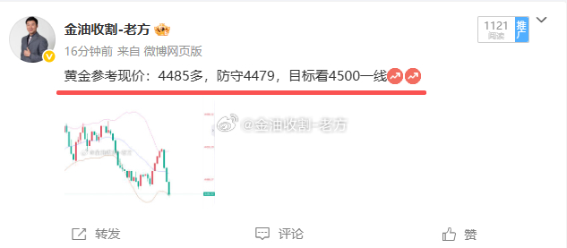 包不完根本包不完,多头坐火箭上涨 黄金4485位置布局的多单目前浮盈70点利润,跟单朋友请及时护利!今天的操作说起来还真是一帆风顺,行情经过反复拉扯后,猛一个探底回升。终于算是为我们多头加速打开了上方的空间。不然今天这苹果还真不一定吃这么尽兴。如果有跟老方在85位置进场多单的朋友们,目前点位可以减仓一次了,剩下的继续持有看4500一线目标。 金价黄金金油趋势实战大师-老方