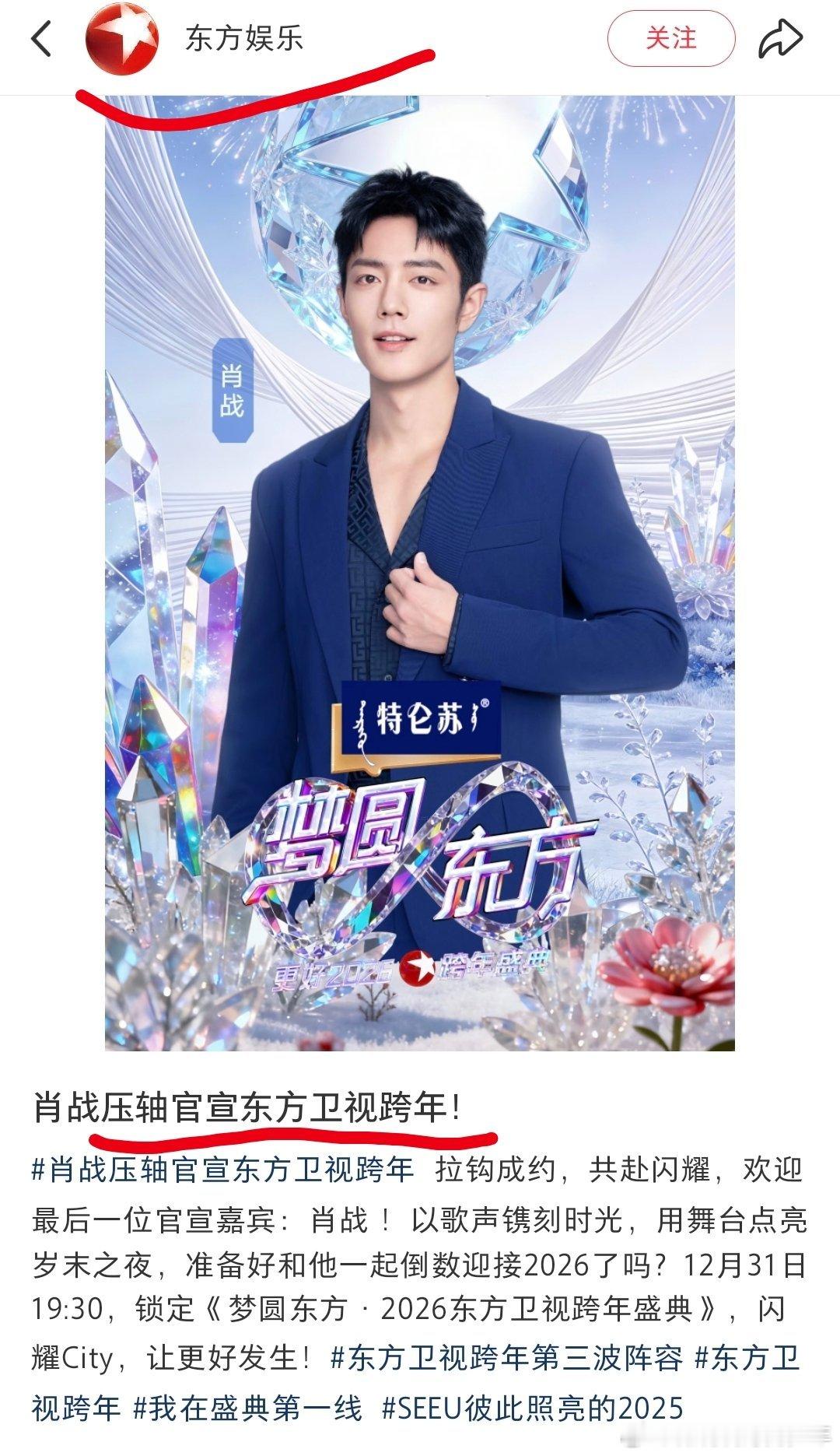 肖战压轴官宣东方卫视跨年欢迎最后一位官宣嘉宾!好直白的压轴,东方很可以呦~今年就守着你看肖战了我想听< 得闲谨制 >!!!把舞台给我炸嗨!肖战压轴官宣东方卫视跨年