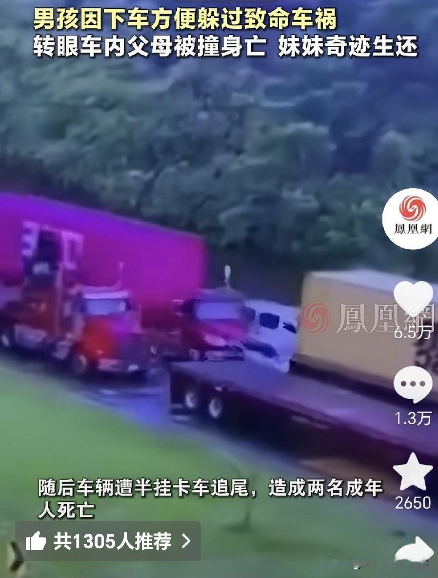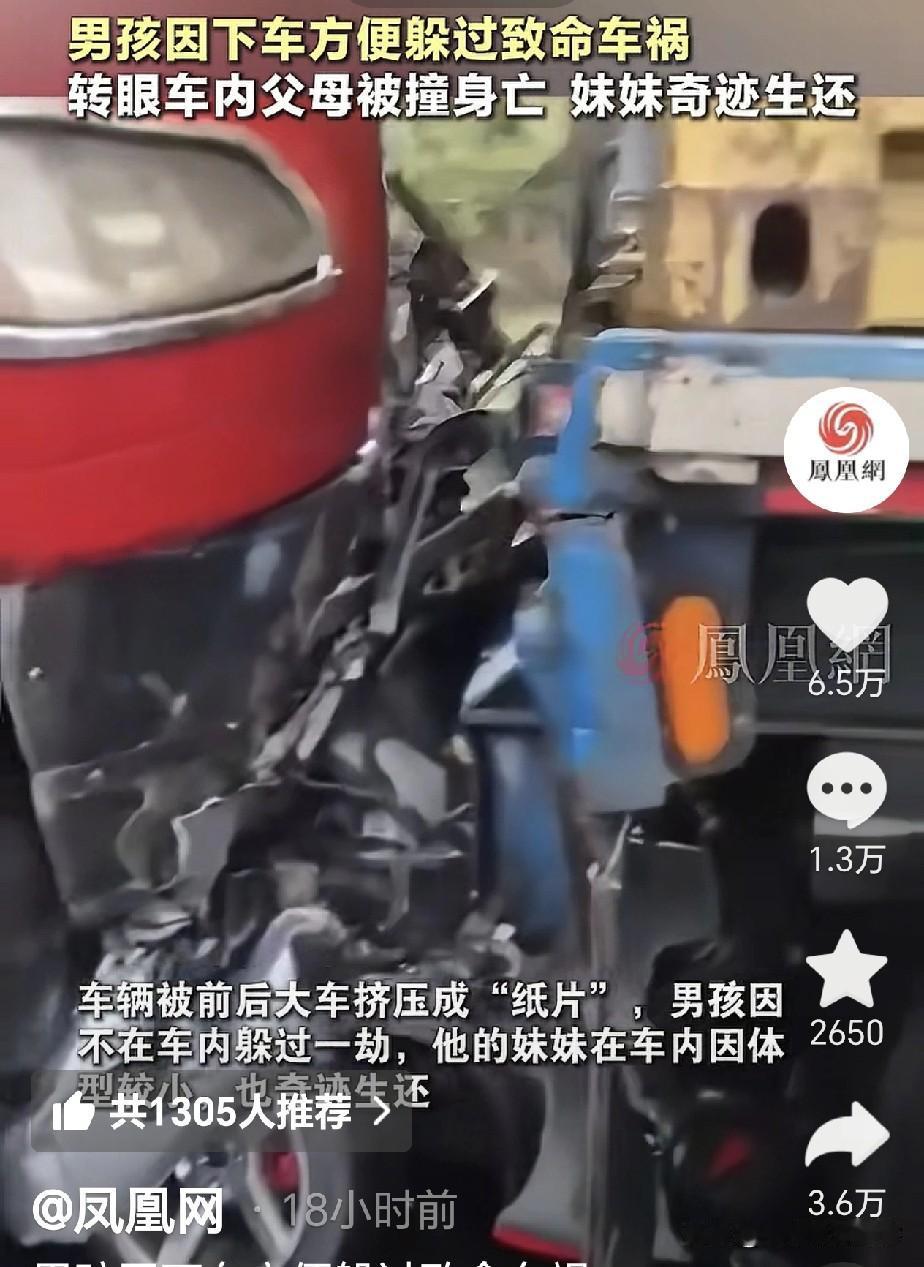 一泡尿惹出的血案,那个幸存男孩怎么办? 哥伦比亚这起车祸新闻,看得人心揪成一团——一家人开车时男孩下车方便,短短几分钟,回来车已被两辆大卡车挤成废铁,父母当场身亡,只有妹妹和他活下来。 妹妹是幸运,他却是幸存。小男孩会不会从此反复折磨自己:“要是我没下车,结局是不是不一样?要是我快一点,是不是能挽回?”这种“如果”的念头,会像毒藤一样缠住他未来所有日子。 明明是意外,他却要背负“为什么死的是父母,活的却是我”的负罪感,这种精神凌虐,比灾难本身更残忍。在自责的无底洞里,他可能永远走不出来。