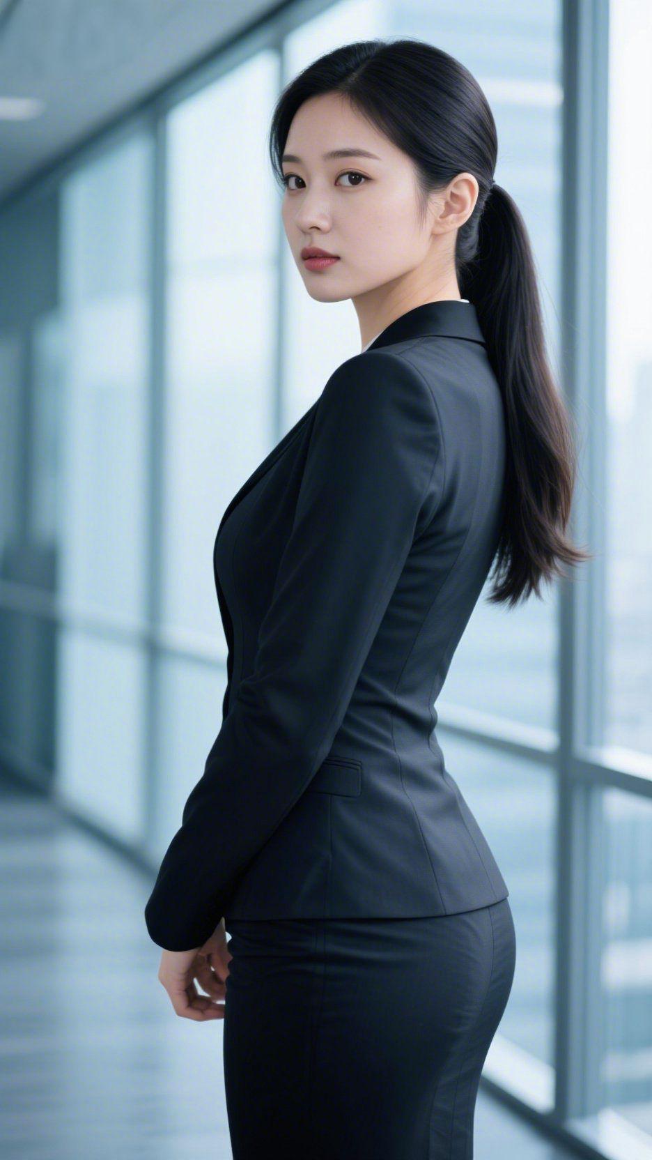 写字楼里的舒展 落地窗外的天光漫入走廊,将冷调玻璃墙晕得柔润。她束着利落马尾,发梢轻垂肩后,把职场干练揉进发丝的弧度里。 黑色西装裹着舒展质感,挺括肩线衬出清隽身形,袖口妥帖收于腕间,无多余装饰,却让利落气质随衣摆自然铺展。她侧转身,视线轻落时,眉目间的从容与极简空间融成同频的静。 走廊风掠过衣角,将写字楼节奏放缓半拍——并非刻板凌厉,是把松弛藏在规整里,让职场姿态,也带着舒展的温度。 职场通勤风 写字楼随记