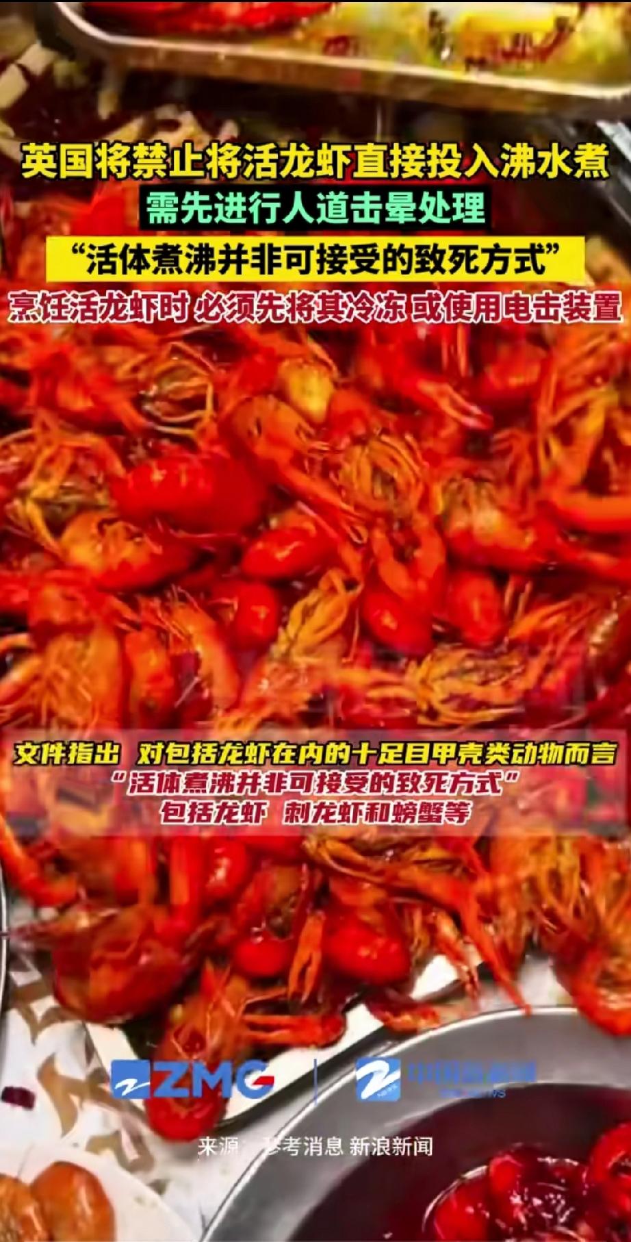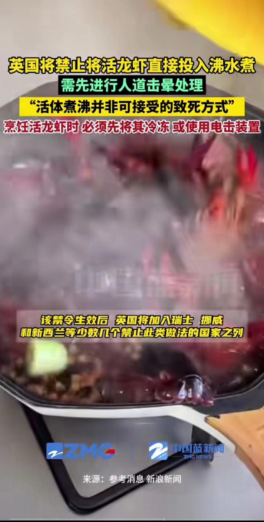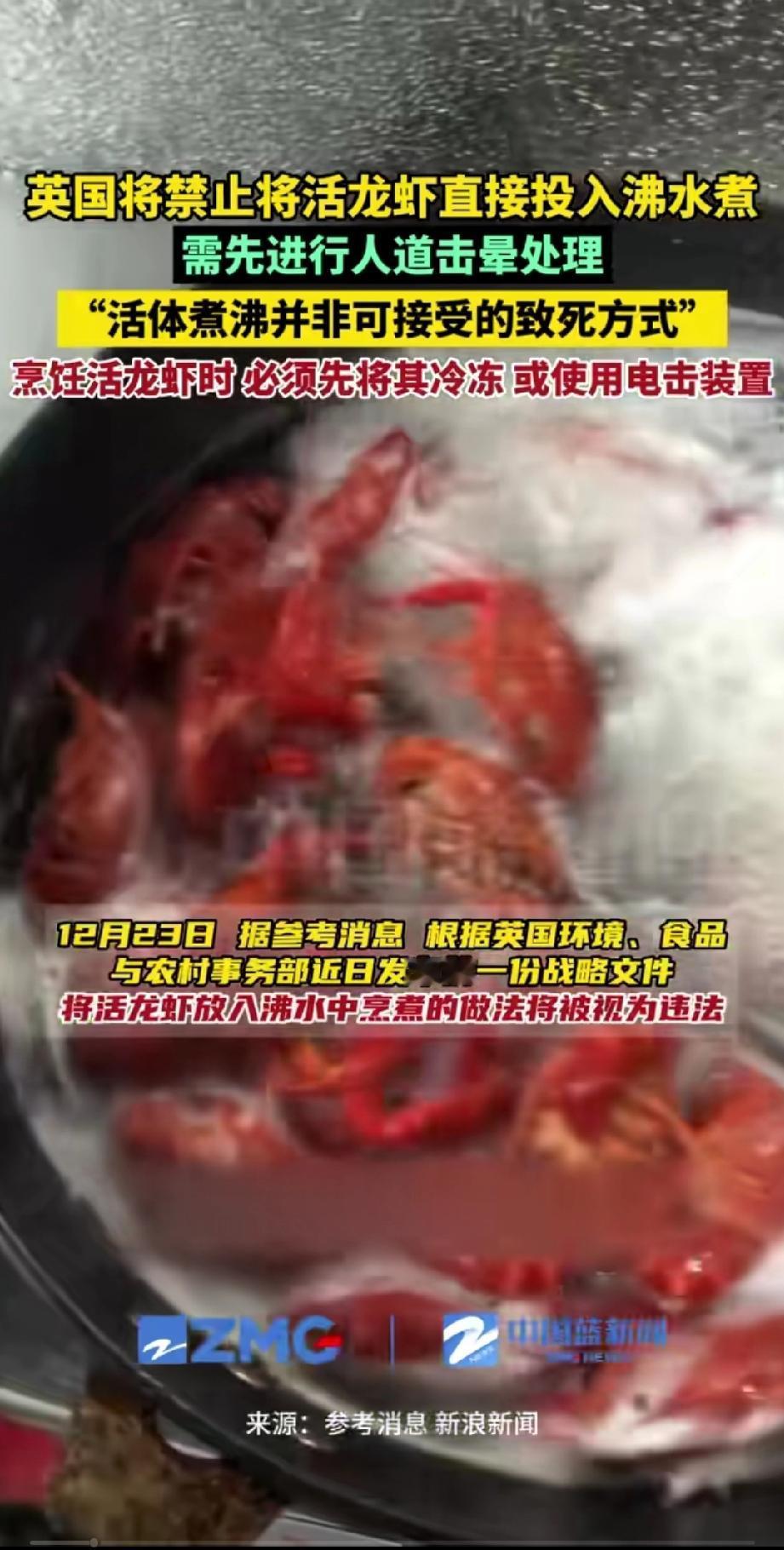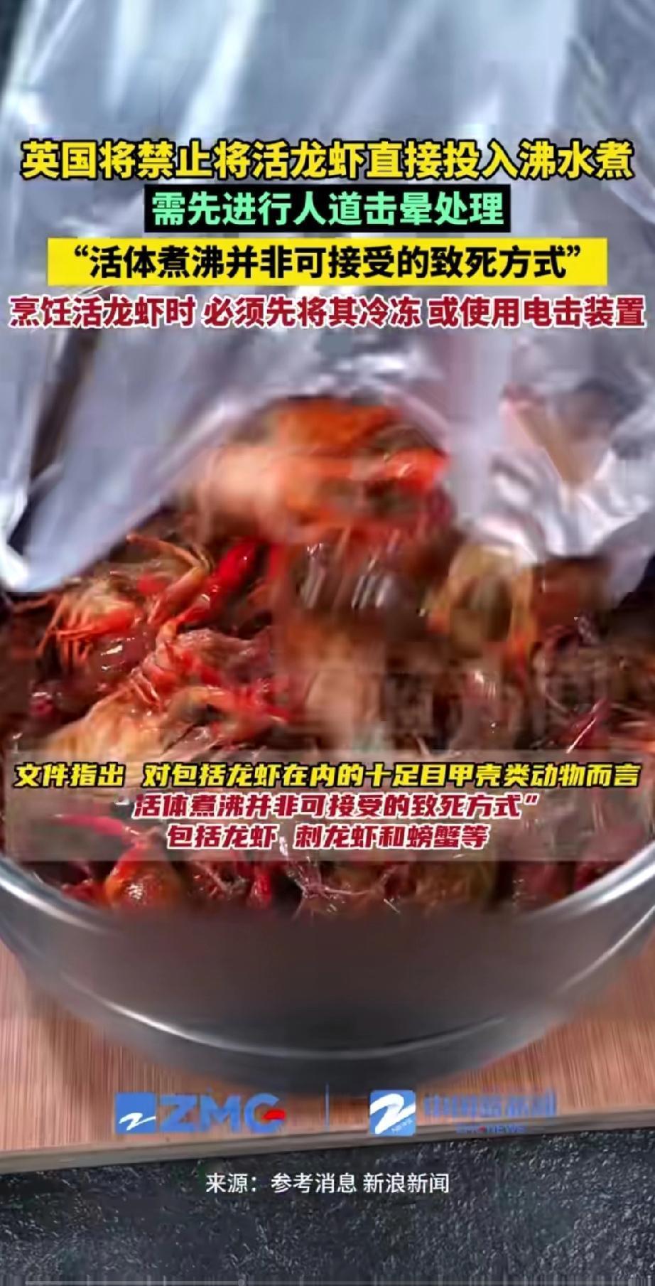 英国人实在是太有爱心了! 英国人觉得把小龙虾直接放进水里煮这种做法实在太残忍了,于是决定发表一项禁令,禁止把活的龙虾直接放在水里煮沸,在进锅之前必须先对龙虾进行人道主义击晕处理! 瞧瞧,不愧是有绅士风度的大不列颠日不落帝国,不但“女拳”打的漂亮,现在还发明了“虾拳”! 中国龙虾馆老板: 在国内打打“虾拳”就算了,千万来我们家!