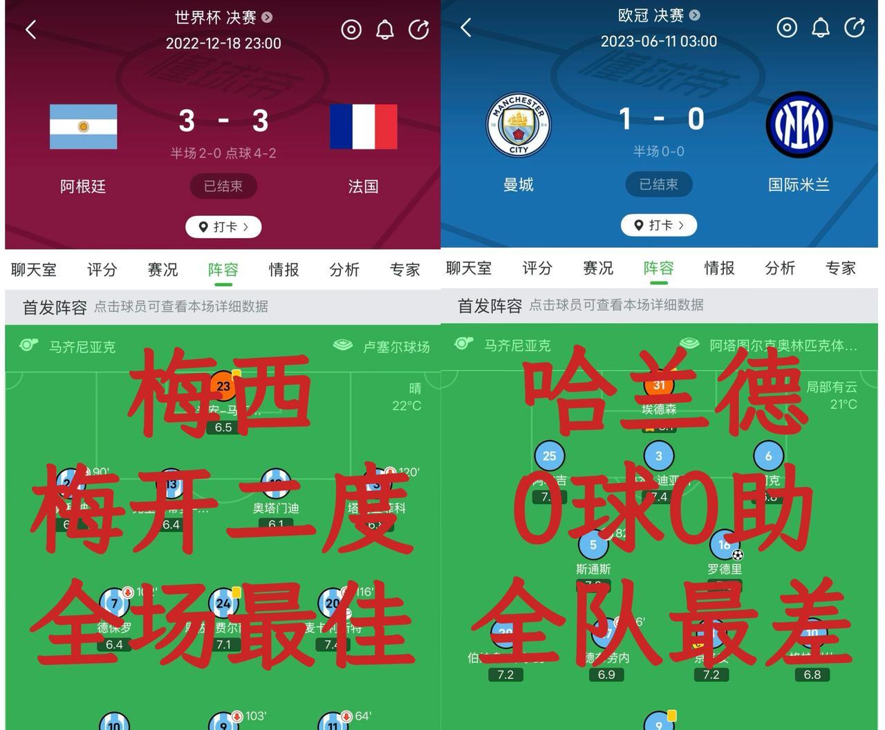 哈兰德至今没有金球奖,有人阴阳怪气:哈兰德拿欧冠那年金球奖被抢走了,比斯内德刀疤脸还冤。 2022-2023赛季,曼城的英超冠军没有太多困难,正如前几个赛季。真正的突破在于欧冠杯,再加上足总杯,组成三冠王。而偏偏就是在两大杯赛中,哈兰德可称软脚,半决赛三场以及决赛两场,0球0助。这样的表现,怎么跟世界杯7球3助,决赛双响,夺得最佳球员奖的梅西比? 世界杯决赛,梅西是全场最佳;欧冠杯决赛,哈兰德是全队最差,也几乎是全场倒数第二三名了。 自来到曼城,哈兰德8场决赛0球0助,人称挪威的特工008。 哪来的逼脸说别人抢你东西?