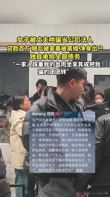 又一个傻女人! 河北女子和丈夫白手起家, 被丈夫哄骗当法人, 然后再以她的名义贷款 400 万。 钱到手后, 她老公马上翻脸不认人, 直接让她净身出户, 还背负 400 万的贷款! ​之前就跟大家说过 夫妻同心,黄土变金的老话,在这个河北女子身上,硬是成了一句扎心的笑话。她陪着丈夫从摆地摊啃馒头的苦日子熬起,把一个小作坊做成了初具规模的厂子,双手磨出的茧子比谁都厚。 没人想到,那个睡在枕边的男人,早就在背地里盘算了一场精心设计的骗局。他先是甜言蜜语哄着她,说法人写她的名字才显得夫妻不分彼此,说贷款是为了扩大生产让日子越过越红火。 她信了,信了这个和自己同甘共苦的男人,在贷款合同上一笔一划签下了自己的名字。她以为这是奔向好日子的新起点,却不知道,这是把自己推进万丈深渊的开始。 400万贷款到账的那天,男人还带着她去下了馆子,点了她最爱吃的红烧肉。酒桌上的温情脉脉,转头就变成了法庭上的冷漠无情。他早就偷偷转移了公司资产,连家里的存款都没留下一分。 当离婚协议书甩到她面前时,她才惊觉天塌了。房子车子归男方,公司成了空壳子,而她,不仅被净身出户,还背上了那笔压得人喘不过气的400万债务。 这种夫妻反目、利用法人身份转嫁债务的案例,这些年其实不算少见。有数据显示,近三年来,全国法院受理的类似民间借贷纠纷中,配偶一方被恶意牵连的案件占比超过15%。 很多女性因为信任,稀里糊涂当了法人,却根本不懂法人要承担的法律责任。一旦公司出现债务问题,法人就是第一责任人,哪怕你一分钱没花,法律的追责也不会留情。 这个河北女子不是第一个受害者,也绝不会是最后一个。那些打着爱情旗号的算计,比明晃晃的刀子更伤人。它撕碎的不只是婚姻,还有一个人对人性的所有信任。 有人说她傻,傻到把自己的名字当成了爱情的信物。可换个角度想,谁能想到,那个曾经和你一起扛过风雨的人,会在背后狠狠捅你一刀。 婚姻里最可怕的从来不是穷,而是枕边人的算计。它提醒着所有在婚姻里付出的人,信任要有底线,爱要带点清醒,别让自己的真心,变成别人牟利的工具。 各位读者你们怎么看?欢迎在评论区讨论。