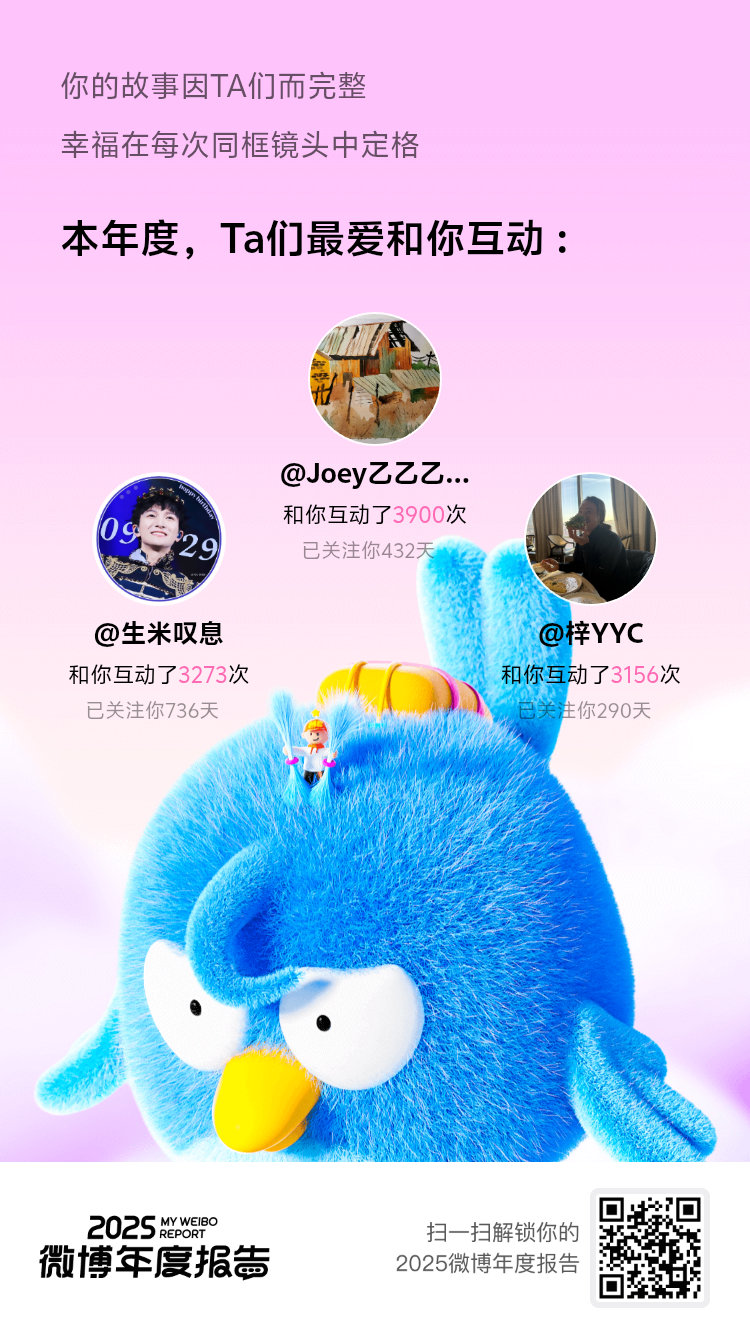 微博年度报告一路同行的回忆闪闪发光,每一次互动都如此美好。感谢让我的日常分享变成值得回放的片段~新一年,继续和你们在微博里相遇、记录、陪伴,一起写下更多故事吧~微博之夜 2025微博年度报告