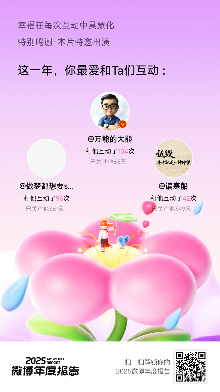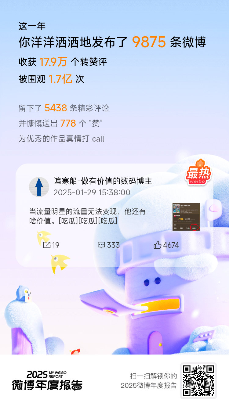 微博年度报告 实力这一块,咱确实拿捏了!2025年稳稳保持 金V身份62天,橙V身份303天!相逢的意义在于彼此照亮,这份成绩单离不开你们一直以来的支持和陪伴!你的专属年度播报也已生成,速来>>2025微博年度报告 围观!微博之夜