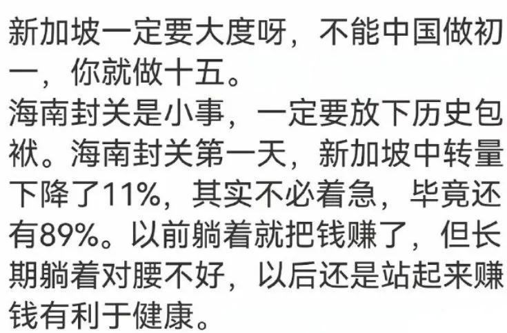 新加坡在马六甲海峡,这里是非洲、欧洲、中东到大洋洲、美洲、东亚、南亚的航运要道。看地图就知道,它跟海南根本就不挨着,去海南大部分本来就要经过马六甲海峡,再说,谁会舍近求远跑去海南绕一圈? 且不说船靠码头不是共享单车随便停路边,根本不可能一天忽然大幅度波动。因此,自媒体宣传海南封关让新加坡难受是在造谣。海南封关 新加坡印象