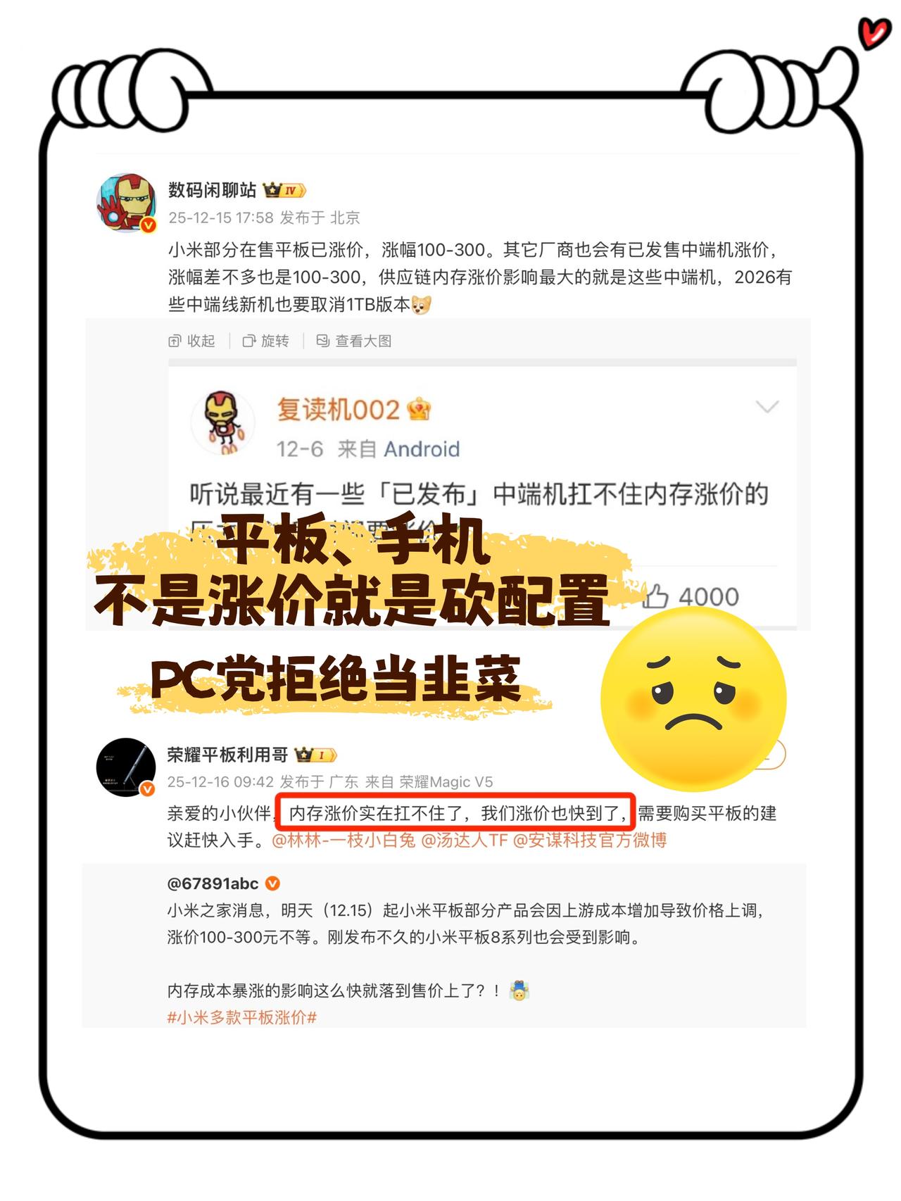 平板手机不是涨价就是砍配置...PC党拒绝当韭菜 我们普通消费者也太惨了叭? 刚刷到数码闲聊站的爆料,小米部分在售平板已涨价,涨幅100-300...荣耀这边也说内存涨价实在扛不住,荣耀平板也要涨价?现在中端手机和平板市场不是偷偷涨价就是阉割配,合着消费者只能当韭菜呗?🙃 只能默默接受这种开倒车,感觉买个设备都得斗智斗勇,这波存储涨价潮真是刀刀砍在穷鬼大动脉上…… 不过咱们PC玩家可以淡定点 别的不说,光存储升级这块就自由到飞起 不像手机平板全焊死,PC的SSD随便换、规格任选,升级节奏自己掌控 所以说,最近如果想给电脑提速,真没必要跟着涨价节奏硬上死贵的PCIe 4.0或5.0,成熟稳重的PCIe 3.0固态速度完全够用,打游戏、装系统、存文件全都不在话下,而且价格稳如老狗,还能死死压住装机成本,省下的钱加条内存不香吗? 推荐几款我做过功课的高性价比PCIe 3.0 SSD⬇️ 👉 梵想 S500:国产老牌,用的海力士、长江等大牌颗粒,温控稳,适合做仓库盘,还有五年保 👉 闪迪plus加强版:大厂出品,读取速度2400MB/s,散热优化稳、兼容性强,懒人首选 👉华迅武迅WX-P3:这个用的也是大牌原厂存储颗粒,搭配联芸主控,读取速度上到3500MB/s,又快又稳,关键还有国资背景+自有工厂+五年保修+以换代修,质量稳得住,可以说要性价比有性价比,要售后有售后👍 💡总之手机平板涨价咱管不了,但PC升级的主动权永远在自己手里 省300升级SSD,战3年不是梦,这才是理性消费