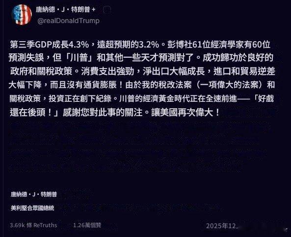 12/23/25🔥🔥针对本年第三季度GDP增长4.3%,打破了预期3.2%,川普总统说,61位经济学家中的60位都搞错了,只有川普和他天才们搞对了。原因就在于川普政府是一个好政府,推行关税。不但如此,消费者支出也很强劲,净出口增加,贸易赤字下降了很多,而且没了通胀(注意:最新通胀只有2.6%,属于美联储目标2%的范围)。他总结说,这都是他的“大美丽法案”的结果,川普经济的黄金时代正在乘风破浪,而你们还没看到真正的腾飞呢!川普用经济事实,再次戳穿了所谓的经济学家,其实就是一群穿着经济学家外套的舆论狗。记得拜登时期,40几名诺奖经济学家,居然称赞通胀高达9.1%的拜登经济“一片大好”,你就知道他们都是一群什么货色了。他们就是民主党的“经济活动家”,早就抛弃了真正的学术,而是用他们的头衔换取名誉和金钱的舆论煽动者。川普正用“川普经济学”碾压一切学术混球,用事实打他们的脸,让人看得爽极了。👇