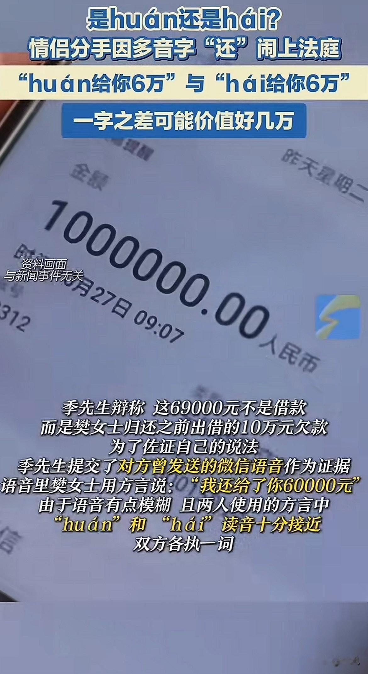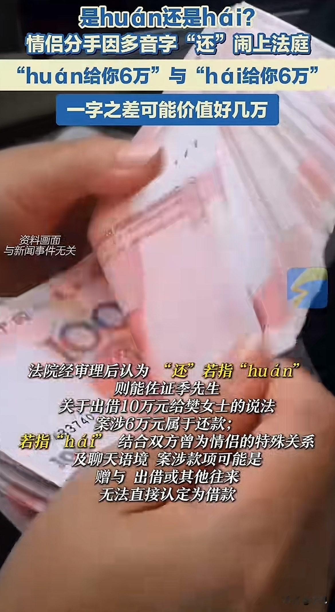 女的转给男的69000,男的转回去8000。分手后,女的说这是借款,要对方还钱。法庭上,男的掏出一段微信语音,里面女方用方言说:“我还给了你60000元。”麻烦来了,当地方言里,“还(huán)钱”和“还(hái)有”听着差不多。 就这一个字的理解,成了关键。法官认为,如果意思是“归还”,那这钱可能是女方在还男方之前的债;如果意思是“还有”,那这钱性质就模糊了,可能是赠与或其他。结果,女方除了转账记录,拿不出任何借条或明确说是借钱的聊天记录,证据不足,官司输了。 说到底,亲密关系里的经济往来,感情好的时候怎么都行,一旦闹掰,法律只认白纸黑字。