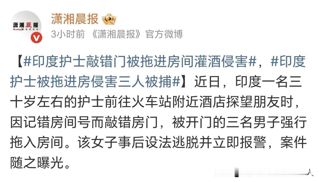 印度一名30岁左右的女护士,本来是去火车站附近酒店的105房找朋友借钱,结果不小心敲错了205的房门,竟被房内3名男子骗进屋里,遭受了长达4小时的侵犯。 后来这三名男子被警方逮捕,身份曝光后让人震惊:两人是银行职员,还有一人是顶级高校的在读硕士研究生。 要知道,在印度,银行职员和名校硕士绝对算得上高知群体。可就是这些看似体面的人,却做出了如此禽兽不如的恶行。 在我看来,学历和身份从来不是衡量人品的标准。不管接受过多少教育,一旦践踏法律底线、侵害他人权益,都必须受到严厉的惩处。只有加大违法犯罪的惩治力度,提高作恶代价,才能真正震慑这类恶行,守护每一个人的人身安全。