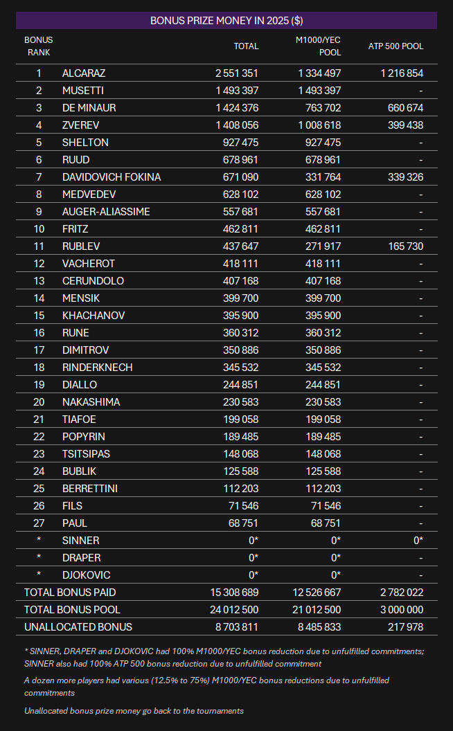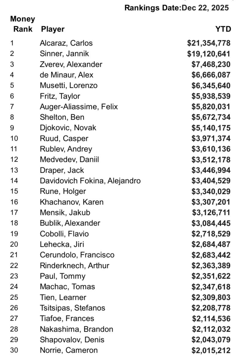ATP年度的分红明细出炉💰阿卡在1000赛和500赛的出色表现,让他拿到了255万美元的额外分红。凭借这笔钱,他在总奖金榜单上超越了辛纳(辛纳缺席太多没有任何分红),合计是2135万4778美元。男网的单赛季奖金纪录是德约2015赛季创下的2164万6145美元。如果计算通货膨胀,这个数字还会更吓人体育大赏我的年度赛场记忆babolatfamily