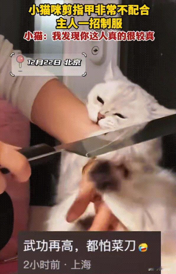 笑不活了!北京,主人给小猫咪剪指甲,但是它非常不配合,压根就不愿意让主人摸它的爪子。下一秒主人一招制服它,那老老实实的样子简直是和上一秒换了一只猫。不过心里肯定特别不服气:你看你,又当真了,这不是跟你闹着玩嘛!网友:武功再高,都怕菜刀! 女子家沙发上有一道深深的抓痕,一开始她很纳闷,不知道是什么东西弄的。后来又发现墙上有一块也很脏,但是可以很明显的看出来是猫的爪子。然后她把猫咪喊来,果然猫咪的爪子的指甲很长了。 女子一气之下,也顾不得教育它犯错了。也来不及去宠物店去剪了,抓过它来就要自己给它剪,但是猫咪保护自己特别强,它压根不让主人摸它。一个劲动压根剪不了一点,女子可犯愁了。 灵机一动想治它的法多着呢,跑去厨房拿来了菜刀,因为家猫咪不知如何特别怕菜刀,就好像是上辈子被菜刀伤害了一样。女子二话不说直接拿去菜刀的背面对准着猫咪的脖子,这可真是管用,吓得猫咪是一动也不敢动。 它的表情出卖了它自己,瞪着眼,乖的不行,主动让主人给剪指甲,还舔一舔主人的手背来示好。轻轻地叫两声,好像说:我发现你这个人真的很较真,我不是那个意思啊! 说真的猫咪真的很有灵性,在它的眼里看到了恐惧和害怕,这些小可爱总是把情绪表现在脸上。肯定想:人类真奇怪,玩笑都开不得,真是玩不起呢,还一点耐心也没有,本来是跟她闹着玩的,结果来真的! 对于这件事情,大家有什么看法? 信息来源:普陀潮