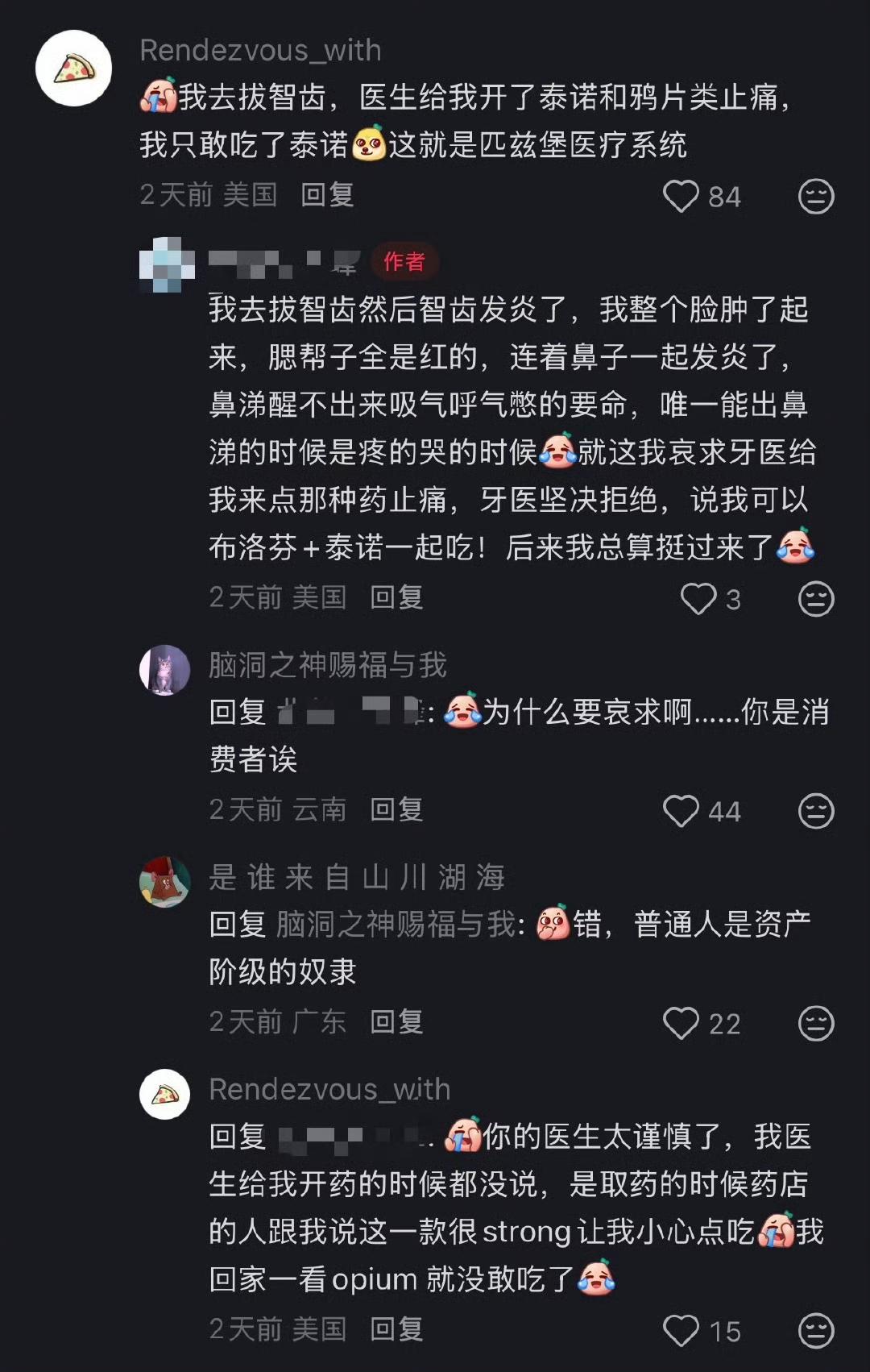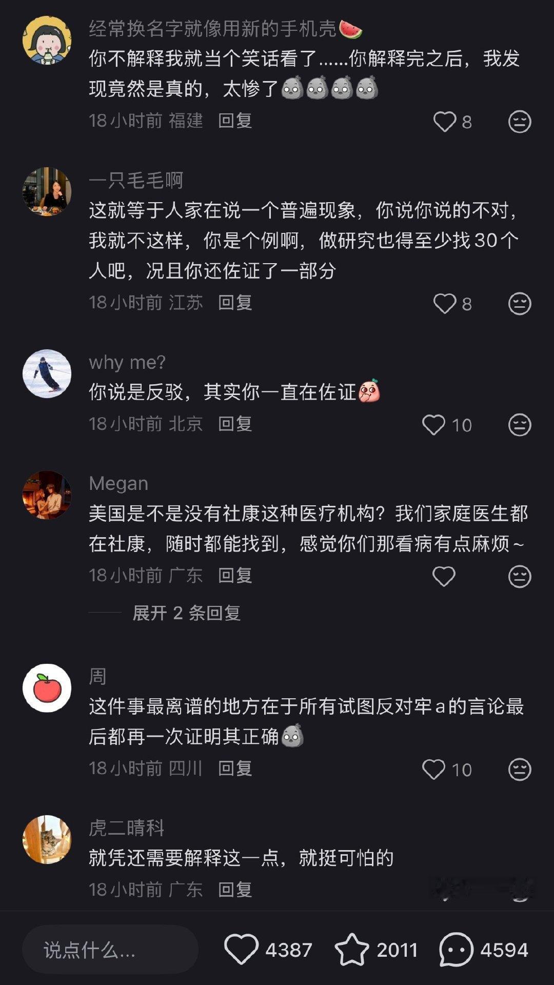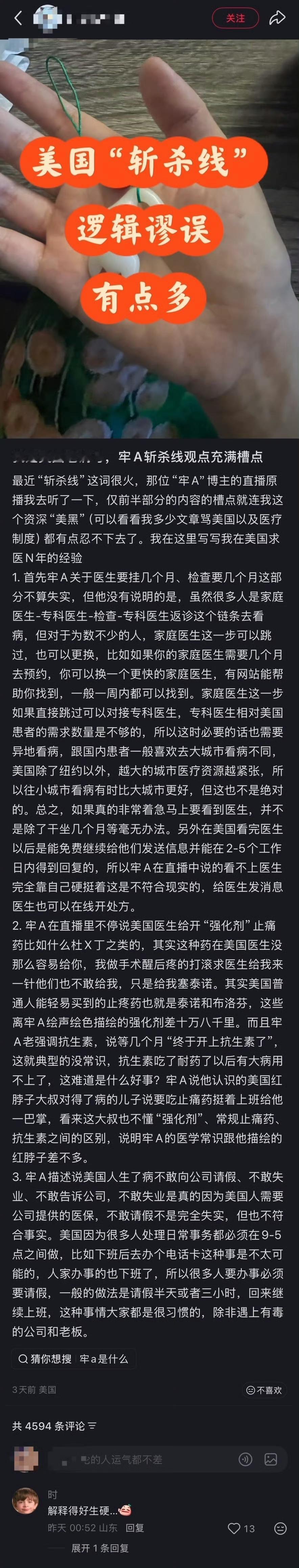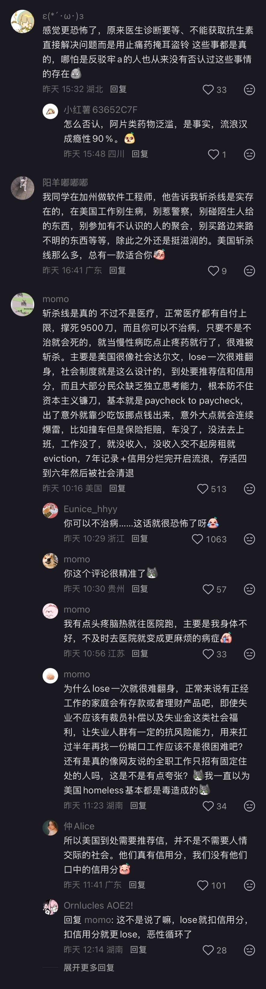 “回国看病”?与代美国版“何不食肉糜”! 有在美国的华人网友反驳牢A关于医疗斩杀线的观点,列了一二三,结果被自己在评论区的那一句“回国治病”给干露馅了。 网友锤击怼他:“美国人回哪个国?!”回国看把我给干笑喷了。 越辟谣,却越描越黑,老A说的是100%,你反而证实了90%。就像有个高达辟谣贴说:路边有高达吗,当然也是有的,但是不会长迪斯科米的,因为很快就有收走(这不就是牢A干的活吗?老A见的更多)。吃城里高达的不是野狗,是郊狼。 这特别像跟人谈着谈着他嘴里出来无数条触手。都被资本主义的克苏鲁给污染了而不自知。 就是有回国兜底,华人才觉得没有什么斩杀线。但美国人又能去哪呢?墨西哥、古巴?他们还有学贷这税哪费,普通人哪还有余钱? “美国人回哪个国?”振聋发瞆啊。麻木不仁,完全没能有力证明否认斩杀线存在的问题,反而他还放大了美国人阶级隔离的社会问题。 不止美国,其他西方国家也差不多。有去以色列交流过一个月的网友说,他们的学长告诉他们一个规则:“一旦身体的不舒服让你觉得要去医院的程度,不要犹豫,直接买机票回中国治病。”