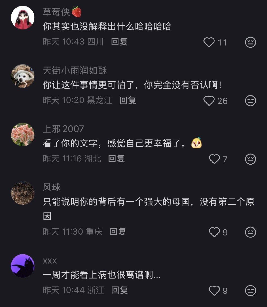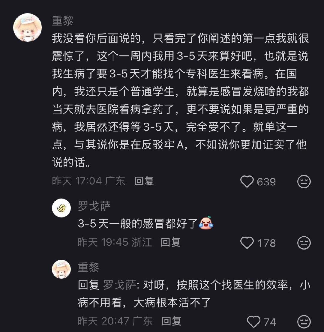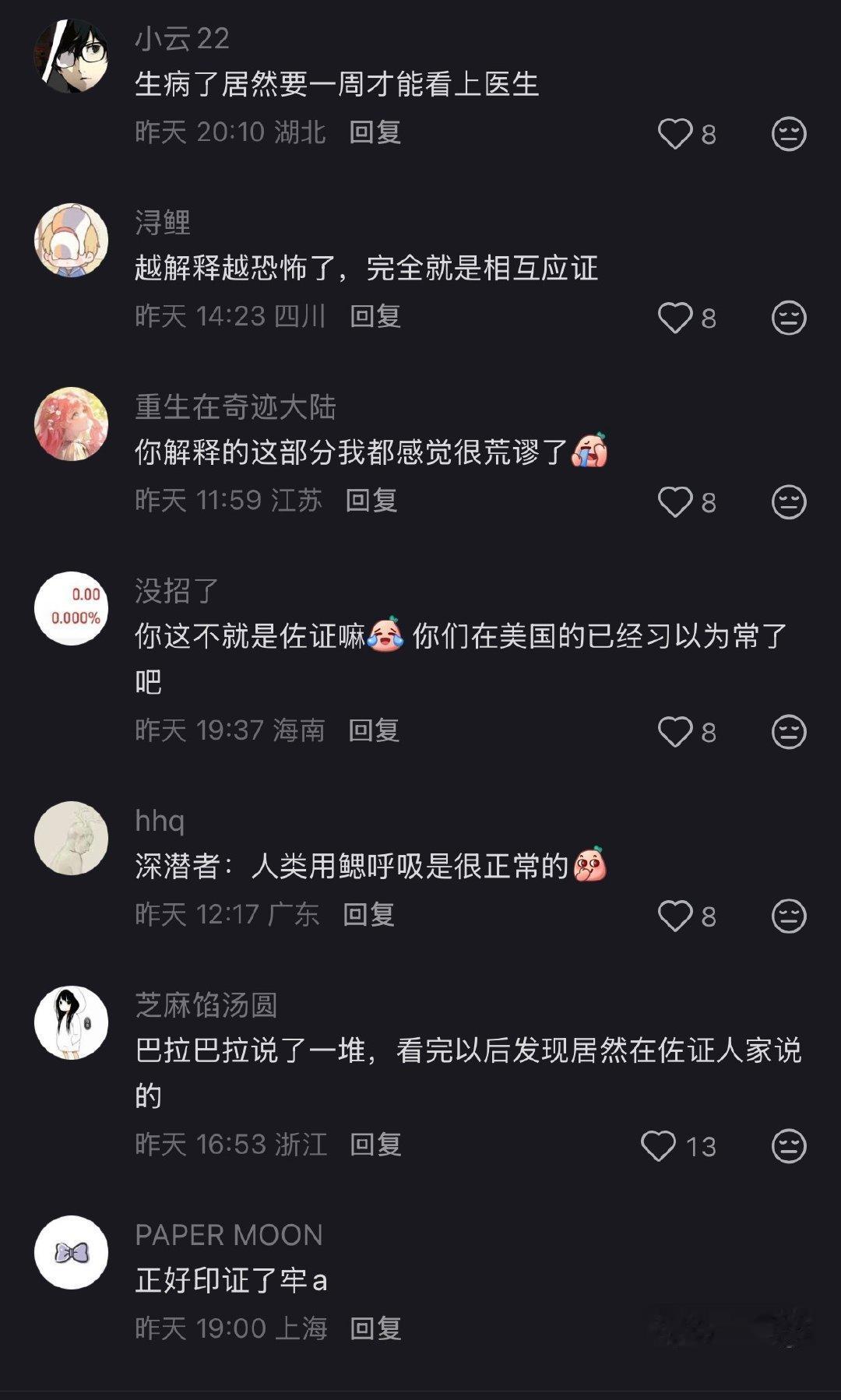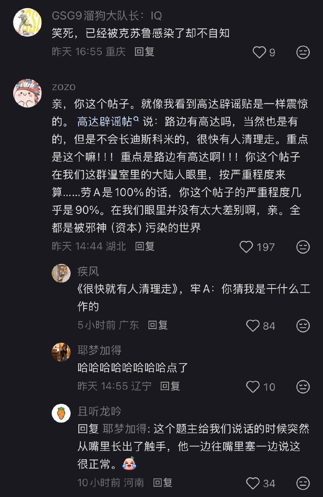 “回国看病”?与代美国版“何不食肉糜”! 有在美国的华人网友反驳牢A关于医疗斩杀线的观点,列了一二三,结果被自己在评论区的那一句“回国治病”给干露馅了。 网友锤击怼他:“美国人回哪个国?!”回国看把我给干笑喷了。 越辟谣,却越描越黑,老A说的是100%,你反而证实了90%。就像有个高达辟谣贴说:路边有高达吗,当然也是有的,但是不会长迪斯科米的,因为很快就有收走(这不就是牢A干的活吗?老A见的更多)。吃城里高达的不是野狗,是郊狼。 这特别像跟人谈着谈着他嘴里出来无数条触手。都被资本主义的克苏鲁给污染了而不自知。 就是有回国兜底,华人才觉得没有什么斩杀线。但美国人又能去哪呢?墨西哥、古巴?他们还有学贷这税哪费,普通人哪还有余钱? “美国人回哪个国?”振聋发瞆啊。麻木不仁,完全没能有力证明否认斩杀线存在的问题,反而他还放大了美国人阶级隔离的社会问题。 不止美国,其他西方国家也差不多。有去以色列交流过一个月的网友说,他们的学长告诉他们一个规则:“一旦身体的不舒服让你觉得要去医院的程度,不要犹豫,直接买机票回中国治病。”