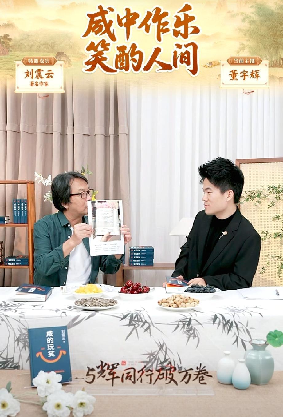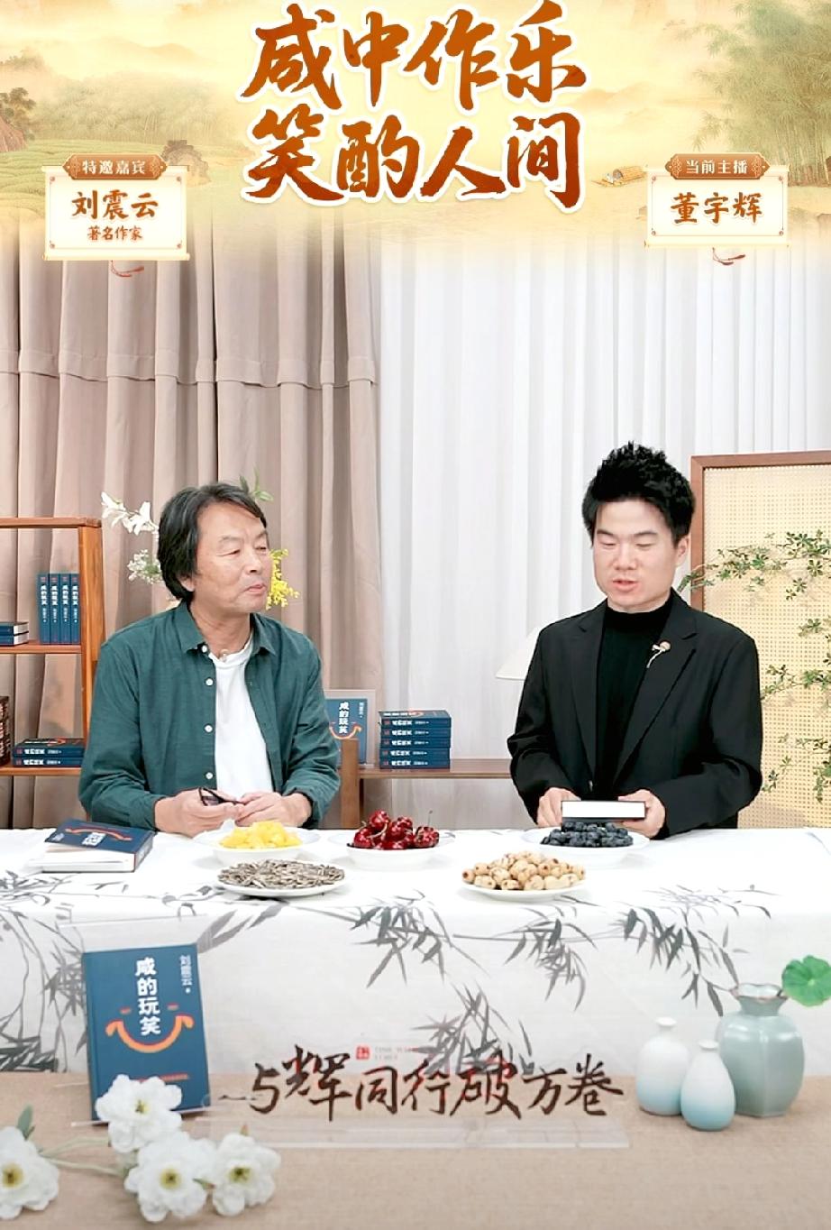 刘震云老师是很理解董宇辉的人之一,他也是打心眼里心疼宇辉。 访谈刚刚开始,刘震云老师说宇辉请他吃了羊杂汤还有草莓。两人谈话看起来特别融洽,就像是家人在聊天一样。 董宇辉说以后经过这里的时候上来坐坐。刘震云老师直接说:“哪天等你累的时候,我来替你,我来替你上去吼几嗓子。 刘振云老师的幽默大家都是知道的。当工作人员送上来一杯水的时候,这个幽默细胞又蹦出来了,直接说到宇辉这里来还有水喝,还说董宇辉是个大方的人。说吃了羊杂汤和草莓都觉得很好,宇辉就让他走的时候带走两箱,他觉得又吃又拿,不太好吧! 两个幽默风趣又学富五车的人聊天,一定能给大家带来不一样的惊喜! 董宇辉 与辉同行 兰知春序